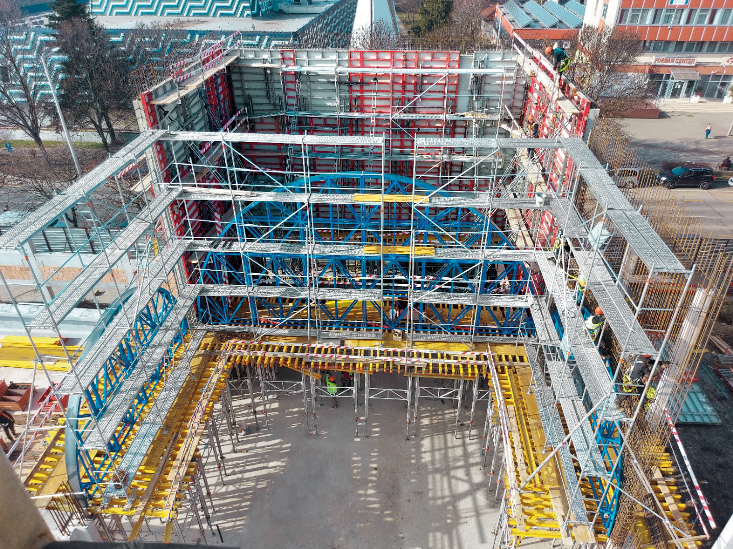 Das modulare Traggerüst MEP sorgte für Sicherheit und Stabilität, stemmte problemlos das hohe Gewicht der Stahlgittergewölbe, Schalungen und betonierten Wände. Aufgrund der Flexibilität der unterschiedlich großen MEP-Rahmenelemente und einfacher Höhenanpassung konnte das Team der B. Build Bauunternehmung den Aufbau jeweils exakt an der Gebäudegeometrie ausrichten. Da MEP aus nur wenigen Grundteilen besteht, ließ es sich einfach und zügig aufbauen und erzeugte keinen engen „Stützenwald“. So verfügten die Anwender in Pécs über komfortable Bewegungsfreiheit. Die Sicherung der 13 m hohen Schalungskonstruktionen gegen Horizontallasten wie Wind- bzw. Staudruck wurde souverän durch die modularen Schrägstützen Triplex gewährleistet.