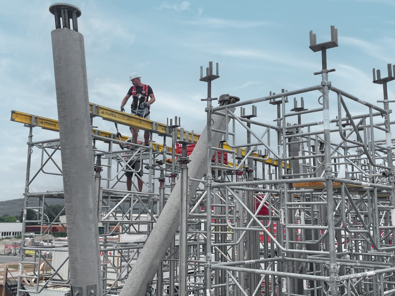 Das B&B Hotel Landmark in der Gemeinde Wiener Neudorf ist ein Blickfänger. Das Gebäude-Layout präsentiert sich als Y-förmiger Grundriss. Die Deckenplatten der Obergeschosse kragen zu allen Seiten unterschiedlich weit aus und die wie übereinandergestapelt wirkenden Etagen scheinen förmlich zu schweben. Schräge Rundsäulen flankieren den Eingangsbereich des Quartiers. Der Komplex besteht aus sieben Etagen. Das 3,40 m hohe Parkdeck im Untergeschoss wurde mit massiven Stützen und Trägern errichtet. Das Erdgeschoss, 5,10 m hoch, schließt das Hotelfoyer und einen 1.300 m² großen Gastronomiebereich ein. Hier wurde die Deckenschalung MevaDec auf dem Traggerüstsystem MT 60 montiert. Darüber befindet sich ein 3,80 m hohes Stockwerk mit Frühstückssaal und Terrassenbereich. Diese drei unteren Etagen wurden allesamt mit Ortbeton errichtet, während in den vier Obergeschossen, jeweils 2,70 m hoch, ein Mix von Ortbeton- und Hohlwänden genutzt wurde.