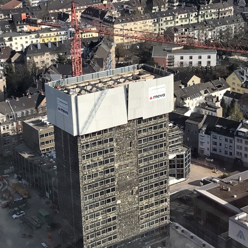 An der Vorderseite der Parkebenen werden aus statischen Gründen Scherwände hergestellt. Zwischen den Wänden sind Glasflächen vorgesehen. Für den Zugang zur Außenschalung war ursprünglich ein konventionelles Gerüst geplant. Die klappbare Arbeitsbühne KAB von MEVA bot jedoch erhebliche Vorteile, da sie in Bezug auf Material- und Arbeitskosten effektiver ist als herkömmliche Gerüste. Die Konsolen können Schalungs- und Zugangslasten aufnehmen. Sie haben sich in dem engen Zugangsbereich zwischen der Gebäudefront und der Grundstücksgrenze bewährt. KAB wird auch für andere ähnliche Arbeiten im gesamten Projekt eingesetzt.