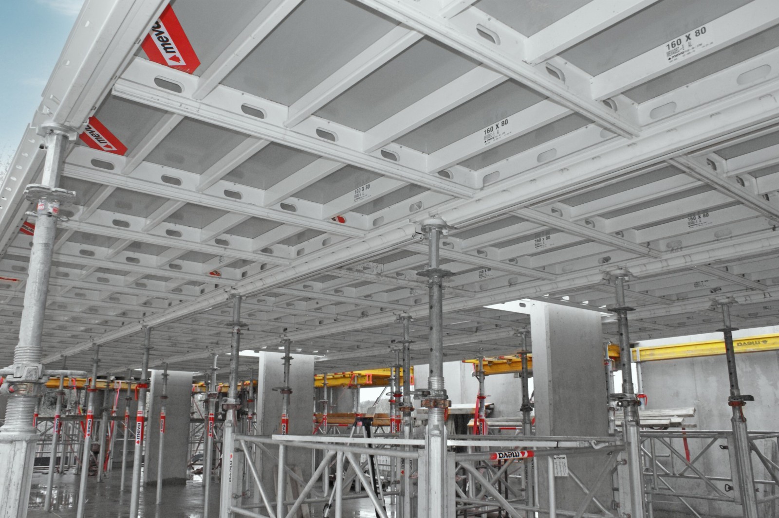 Für jedes Stockwerk müssen rund 2.500 m² Deckenfläche erstellt werden. Das etablierte Bauunternehmen lernte das MevaDec-System bei einer Produktvorführung kennen und entschied sich aufgrund der Zeitvorteile, Sicherheit, Qualität und des geringen Gewichts für den erstmaligen Einsatz. Beim Projekt in Stockport überzeugt MevaDec nicht nur durch kräfteschonende Handhabung. Als großer Vorteil erweist sich auch, dass dieses System nicht an ein festes Raster gebunden ist und sich flexibel an jeden Grundriss und jede Deckenstärke anpassen lässt.