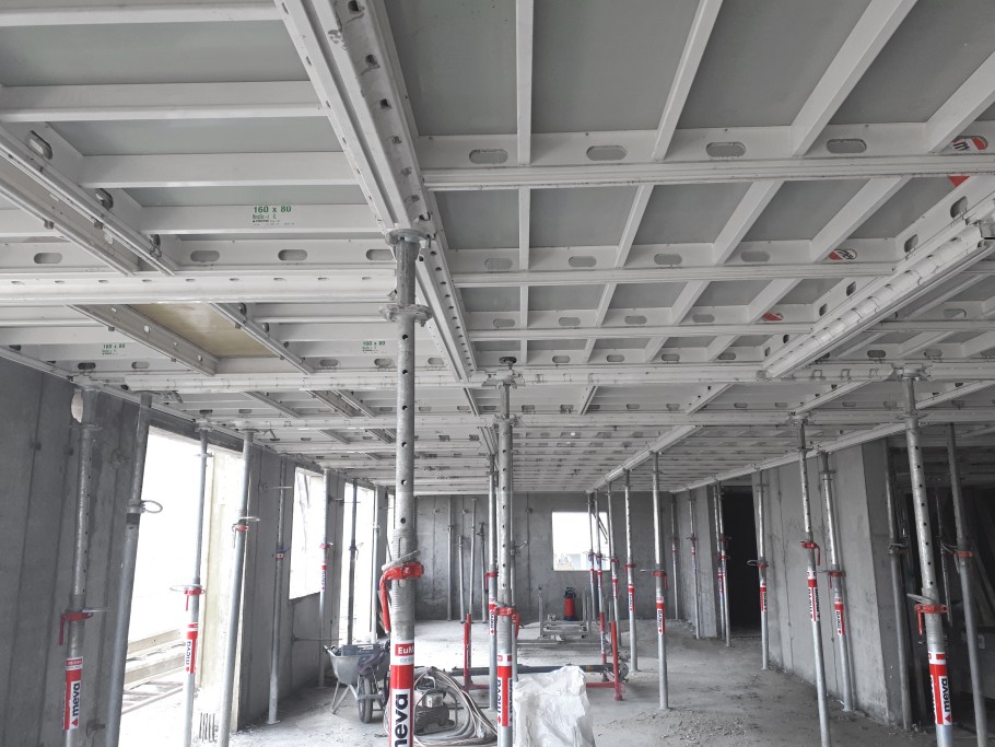 Das erfahrene Bauunternehmen GERSTL nutzte Wandschalung, Deckentische und Bühnen aus eigenem Bestand. Für die insgesamt 54 Regelgeschosse mit je 490 m² Fläche – insgesamt über 26.000 m² Decken – plus zwei Parkgeschosse à 7.000 m² kaufte GERSTL 1.800 m² der Deckenschalung MevaDec. Die richtige Wahl, wie sich bald herausstellte: MevaDec erlaubt eine geringere Materialvorhaltung. Und weil sich zwischenzeitlich die Preise für Schaltafeln aus Holz enorm erhöhten, zahlte sich die serienmäßig montierte alkus Vollkunststoff-Platte gleich richtig aus. Sie ist langlebig und reparierbar, reinigungsfreundlich und nagelbar, nimmt kein Wasser auf, quillt und schwindet nicht. Ihre Oberfläche ermöglicht auch nach über 1.000 Einsätzen erstklassige Betonqualität. Darüber hinaus verfügt sie über eine 7-Jahre-Garantie.
