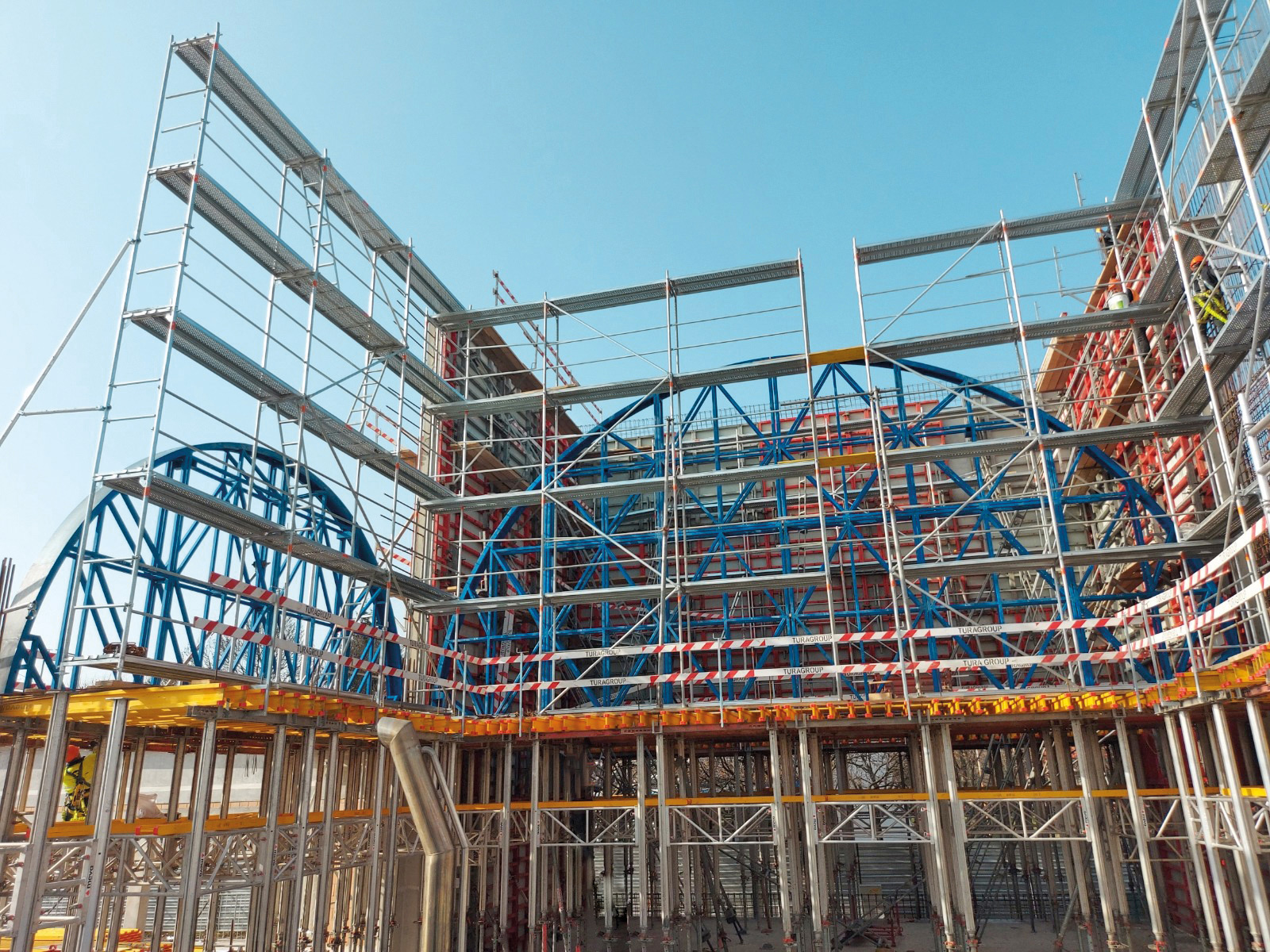 Das modulare Traggerüst MEP sorgte für Sicherheit und Stabilität, stemmte problemlos das hohe Gewicht der Stahlgittergewölbe, Schalungen und betonierten Wände. Aufgrund der Flexibilität der unterschiedlich grossen MEP-Rahmenelemente und einfacher Höhenanpassung konnte das Team der B. Build Bauunternehmung den Aufbau jeweils exakt an der Gebäudegeometrie ausrichten. Da MEP aus nur wenigen Grundteilen besteht, liess es sich einfach und zügig aufbauen und erzeugte keinen engen „Stützenwald“. So verfügten die Anwender in Pécs über komfortable Bewegungsfreiheit. Die Sicherung der 13 m hohen Schalungskonstruktionen gegen Horizontallasten wie Wind- bzw. Staudruck wurde souverän durch die modularen Schrägstützen Triplex gewährleistet.