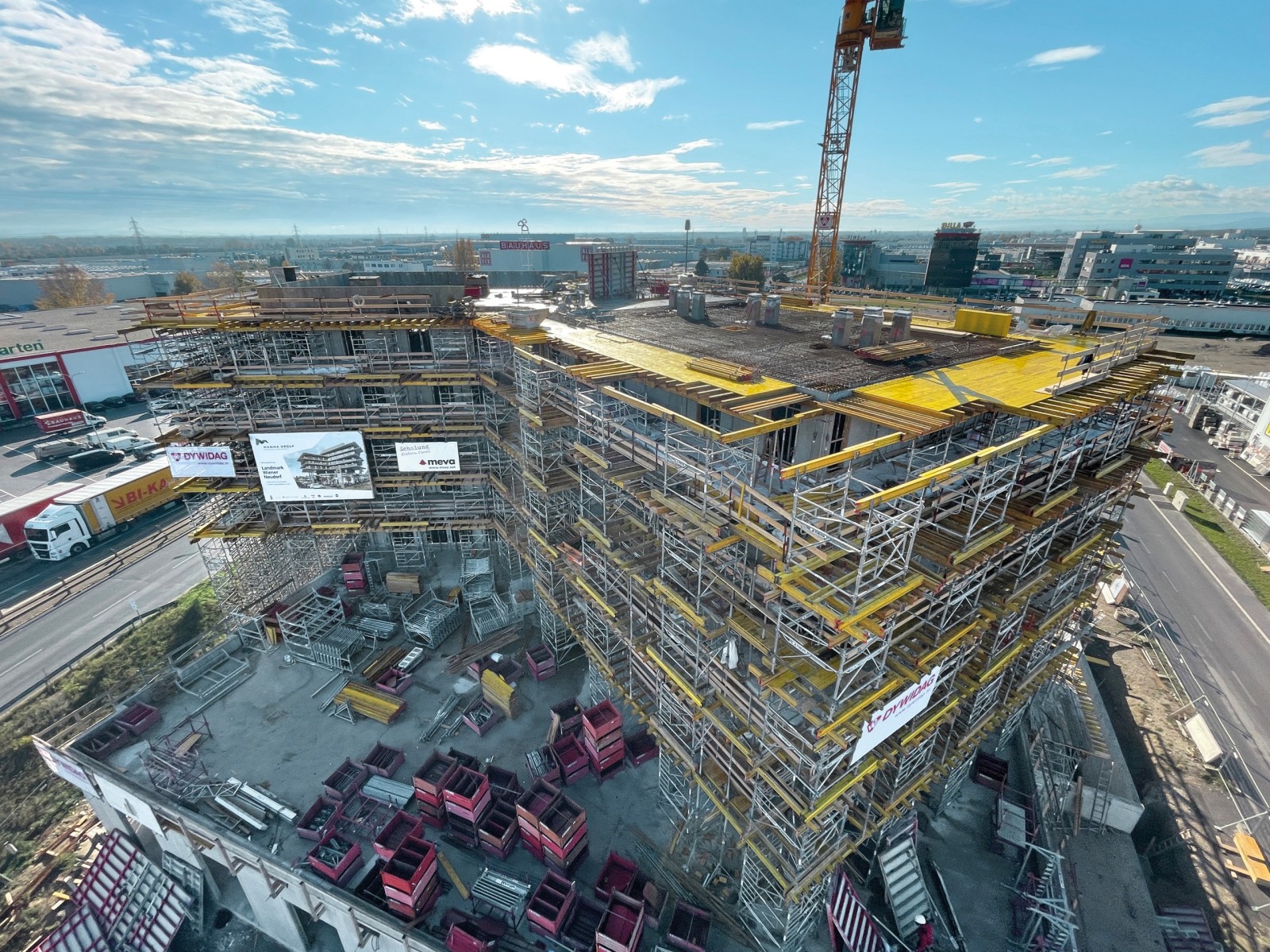 Das B&B Hotel Landmark in der Gemeinde Wiener Neudorf ist ein Blickfänger. Das Gebäude-Layout präsentiert sich als Y-förmiger Grundriss. Die Deckenplatten der Obergeschosse kragen zu allen Seiten unterschiedlich weit aus und die wie übereinandergestapelt wirkenden Etagen scheinen förmlich zu schweben. Schräge Rundsäulen flankieren den Eingangsbereich des Quartiers. Der Komplex besteht aus sieben Etagen. Das 3,40 m hohe Parkdeck im Untergeschoss wurde mit massiven Stützen und Trägern errichtet. Das Erdgeschoss, 5,10 m hoch, schließt das Hotelfoyer und einen 1.300 m² grossen Gastronomiebereich ein. Hier wurde die Deckenschalung MevaDec auf dem Traggerüstsystem MT 60 montiert. Darüber befindet sich ein 3,80 m hohes Stockwerk mit Frühstückssaal und Terrassenbereich. Diese drei unteren Etagen wurden allesamt mit Ortbeton errichtet, während in den vier Obergeschossen, jeweils 2,70 m hoch, ein Mix von Ortbeton- und Hohlwänden genutzt wurde.