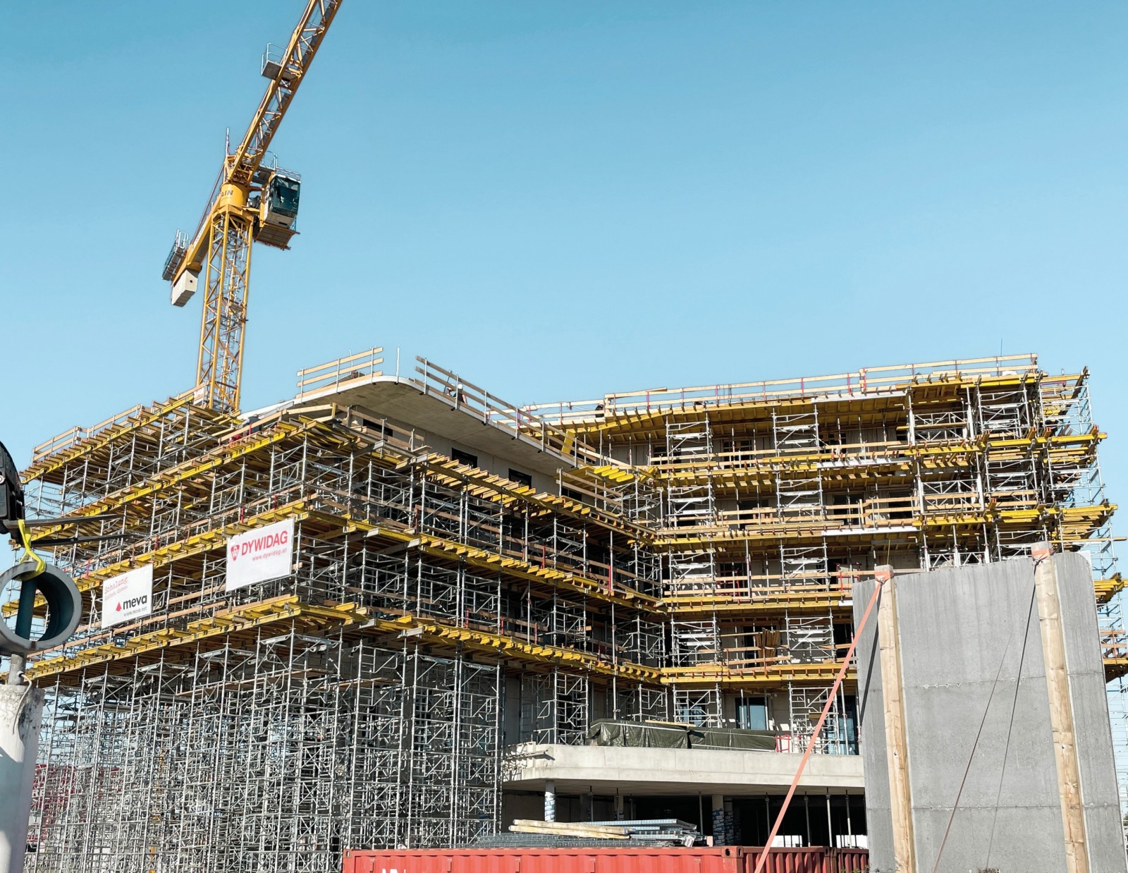 Die konventionelle MevaFlex-Deckenschalung eignet sich aufgrund ihrer Flexibilität besonders gut für wechselnde und unterschiedliche Grundrisse. Sie wurde mit den angelieferten Elementdecken belegt. Als Traggerüst wurde neben MT 60 auch das kompatible MEP-System von MEVA genutzt, das keinen „Stützenwald“ erzeugt, sondern mit wenigen Grundteilen und Rahmen an jede Gebäudegeometrie und Höhen bis 21 m zu adaptieren ist.