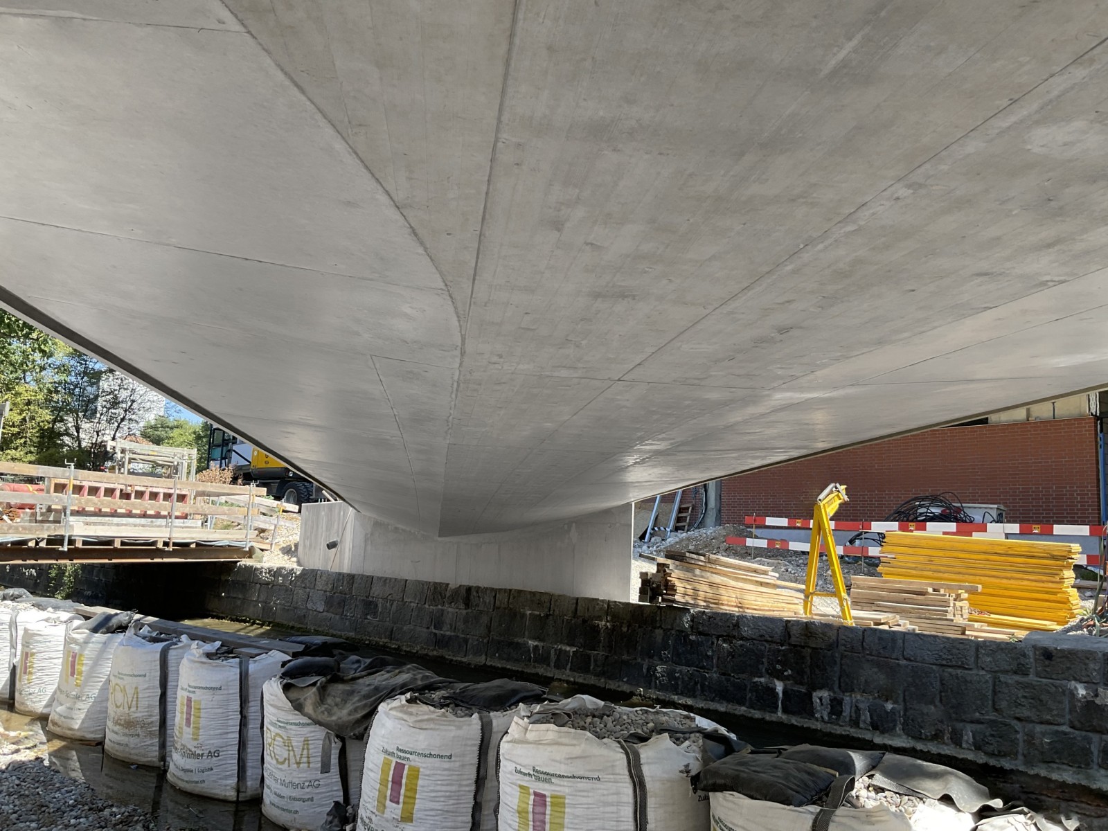 Das Baustellenteam der Marti AG Basel um Polier Tehvid Mahic errichtete die Brücke problemlos im Zeitrahmen und in der geforderten Qualität. MEVA Schweiz setzte die Schalungsplanung um, rund 120 m² Sonderschalung für den einmaligen Einsatz wurde von Kiefer Schalungsbau aus Holz hergestellt. Zu berücksichtigen waren Installationen für die Betonage von Wassernasen sowie die Unterlegung mit variablen Knaggen für die zuverlässige Ableitung von Kräften.