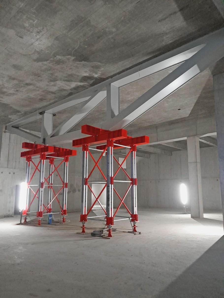 Nun konnte der Stahlfachwerkträger auf den MEKit-Türmen und den Betonstützen aufgesetzt und gesichert werden. Anschliessend wurde das modulare MEVA-Traggerüstsystem MEP aufgestellt, um die Betonage der Decke zu unterstützen. Auch das MEP – bei MOSER häufig im Einsatz – überzeugt durch einfachen und schnellen Aufbau. So war dieses bewährte System eine optimale Ergänzung zum neuen MEVA Engineering Kit.