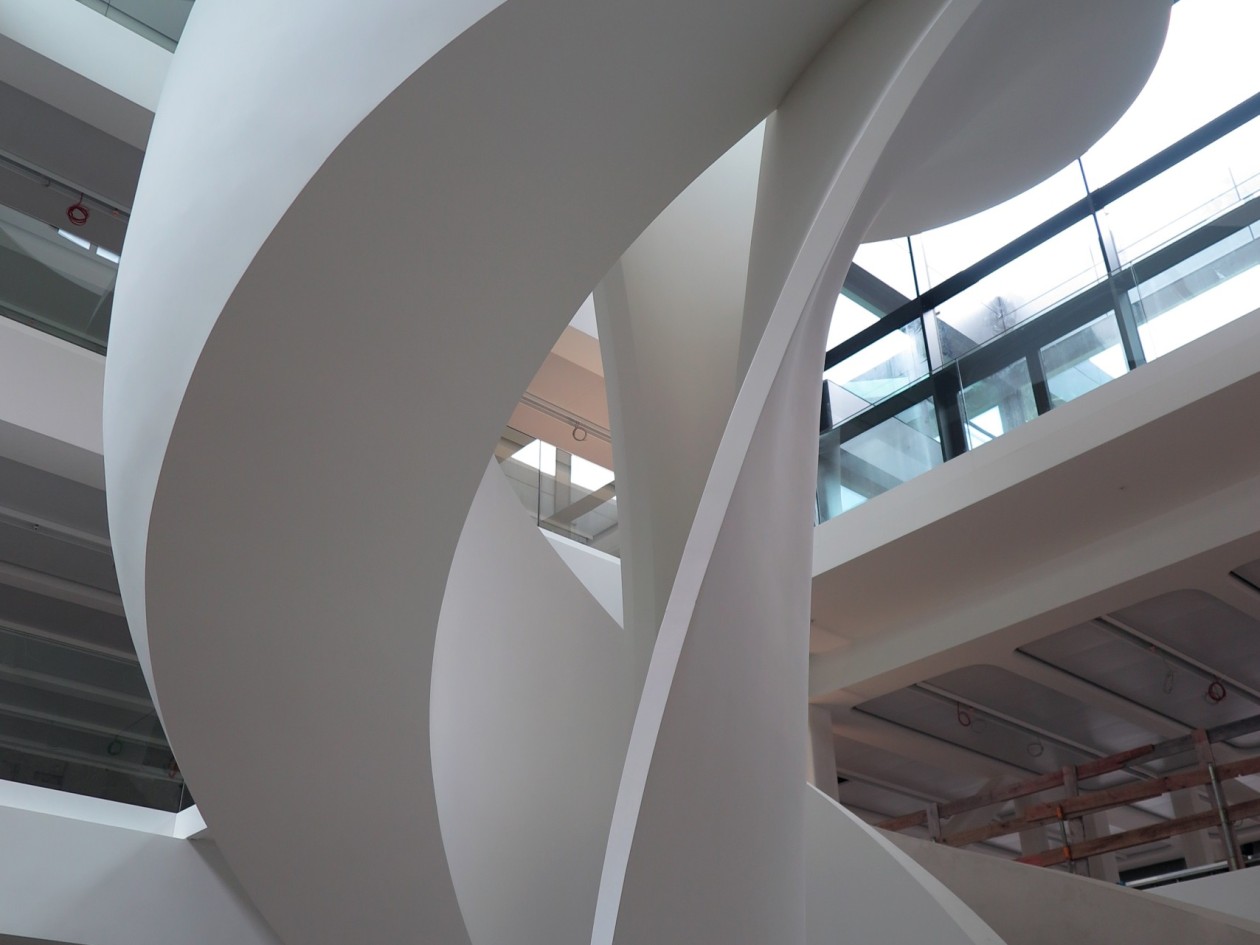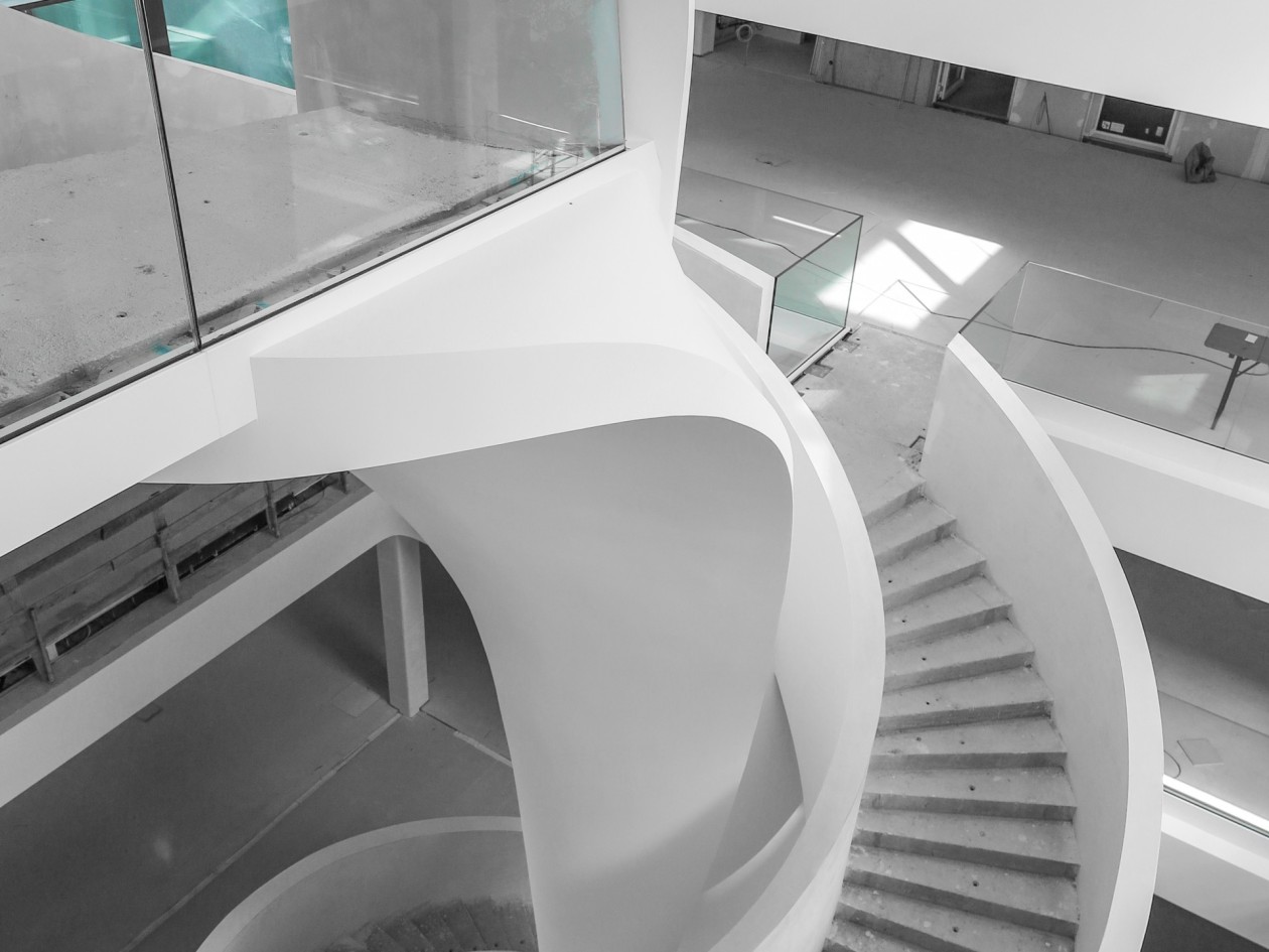 Teil der anspruchsvollen Architektur und eines der schwierigsten Bauteile war der einzigartige geschwungene Treppenaufgang im Foyer, der sich um eine innenliegende Tulpenskulptur in die Höhe dreht.