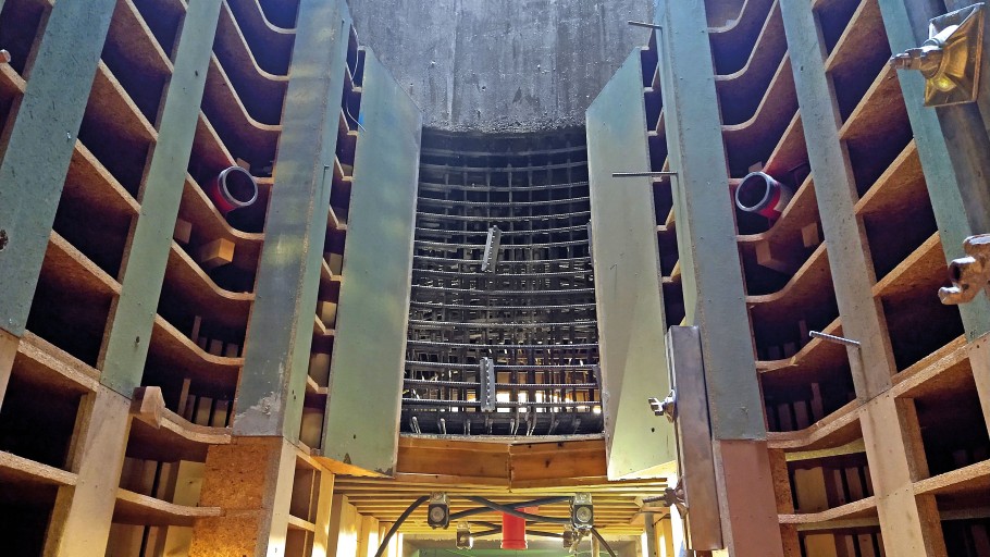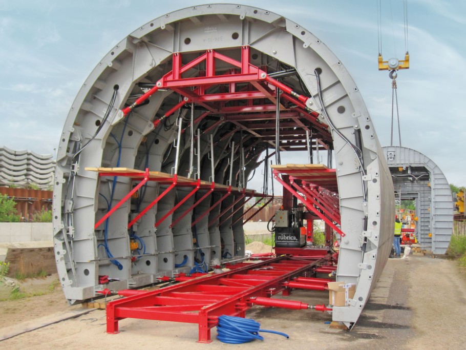Zunächst wurden die bis zu 1,75 m hohen Sohlen (Fundamente) betoniert. Nun konnten Schienen auf der Sohle montiert und der Transportwagen mit dem ersten Segment der Gewölbeschalung hineingefahren werden. Um das 5,75 m breite und 5,25 m hohe Konstrukt durch den engen Eingang manövrieren zu können, wurde die mit Gelenken versehene Rundschalung hydraulisch auf 3,65 x 3,29 m zusammengeklappt und passte nun in Millimeterarbeit exakt durch den engen Anschlussblock. Dann wurde die Rundschalung auf vollen Umfang aufgeklappt.
