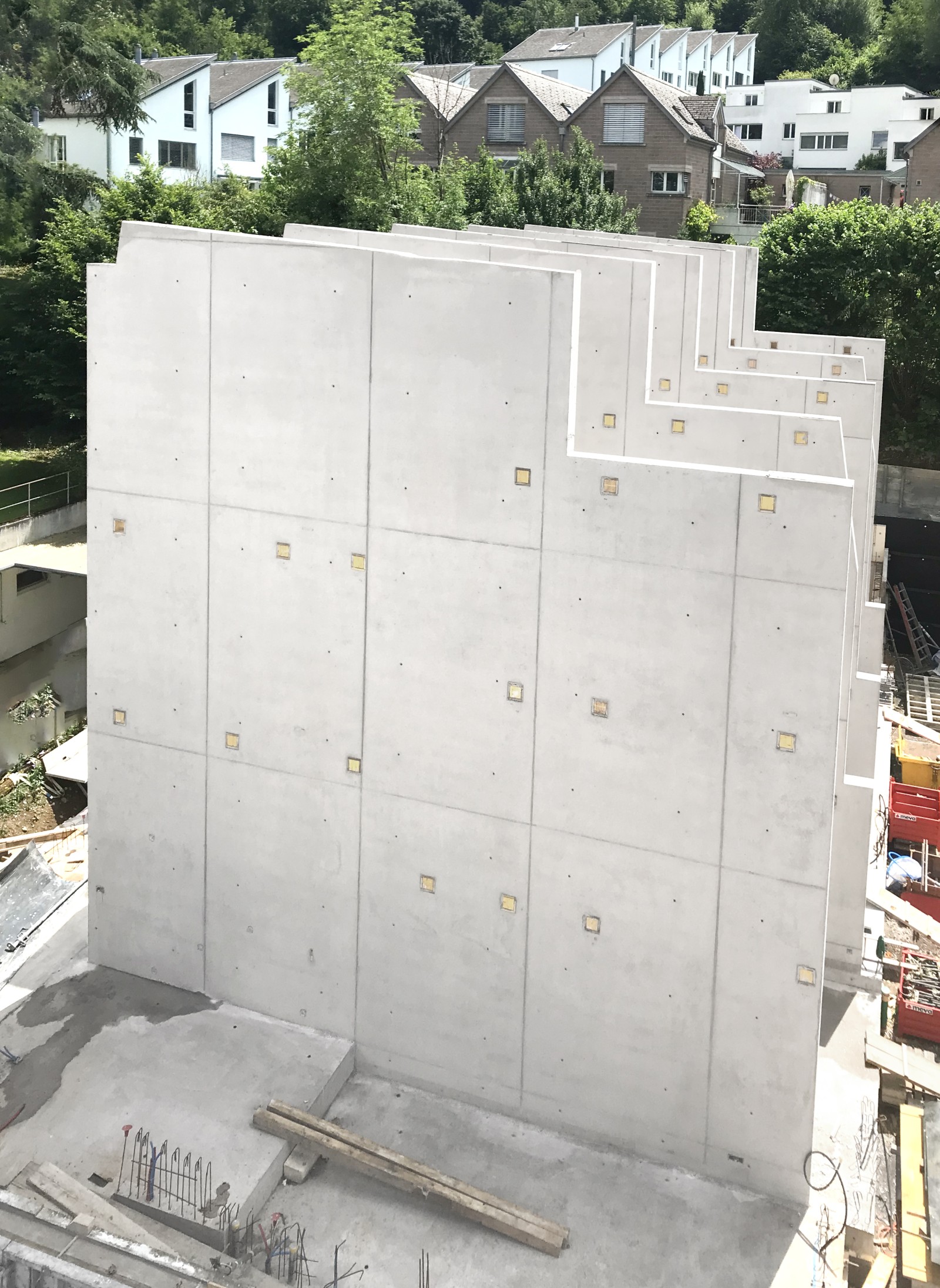 In Baden/Schweiz entstehen zwölf Reihen-Einfamilienhäuser. Die Hächler AG Hoch- und Tiefbau erstellte die großflächigen Trennwände zwischen den Wohneinheiten jeweils in nur einem Takt. Das Resultat erfüllt die vom Bauherrn geforderte Betonoberflächenqualität und die Erwartungen der Architekten sowie des Bauunternehmens.