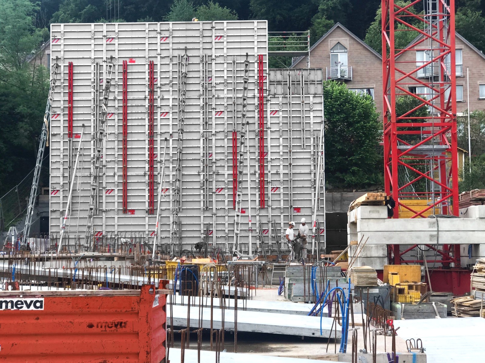 Für eine gesamte Wandfläche von 11,37 m Breite und 10,50 m Höhe wurden insgesamt 15 Mammut-XT-Elemente 350/250 benötigt: fünf nebeneinander und jeweils drei übereinander. Nach dem Ausschalen wurden zwei Elementeinheiten von 10,50 x 5 m sowie eine Einheit von 10,50 x 2,50 m umgestellt. Die Hakenhöhe des Krans wurde entsprechend gewählt, damit die Schalung noch über die betonierten Wände gehoben werden konnte.