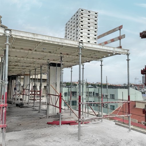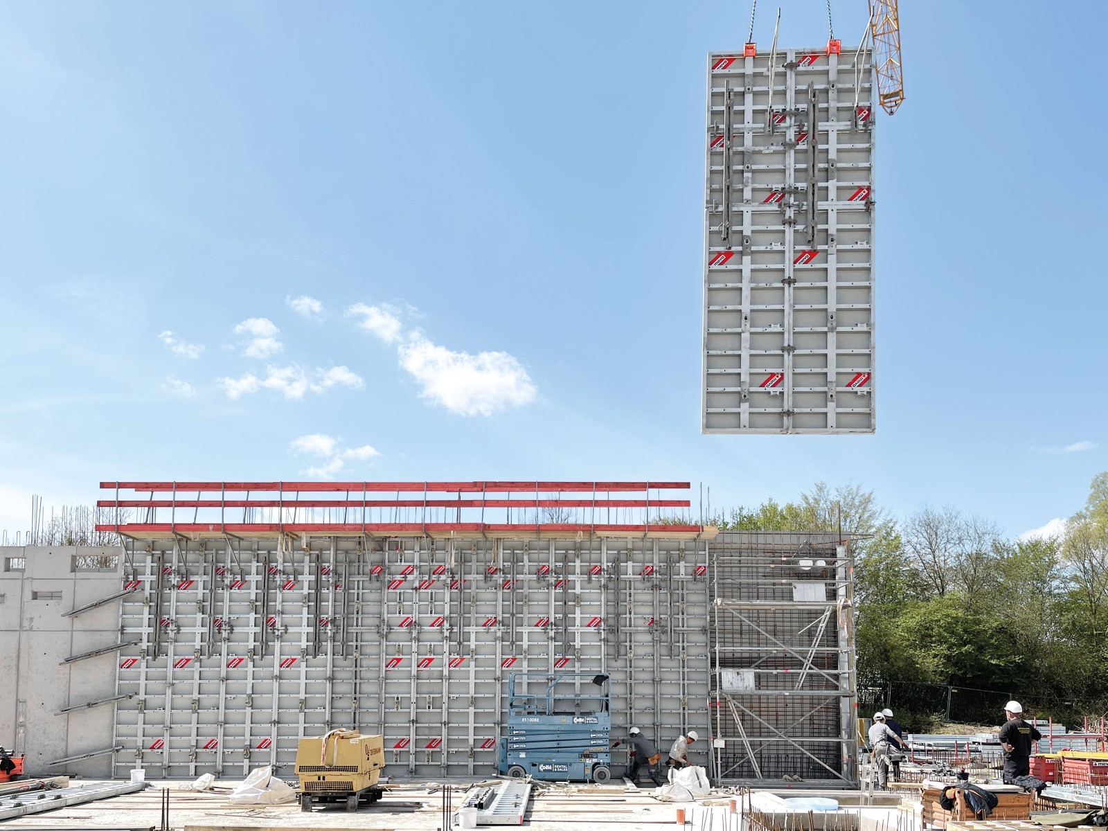 Drei MEVA-Wandschalungssysteme wurden von dem Team um Bauleiter Lukas Kettler und Polier Michael Feismann für unterschiedliche Anforderungen eingesetzt. Das Bauunternehmen entschied sich dafür, die Schalung von der MEVA-Niederlassung Rhein/Ruhr per Komplettpaket MietePlus anliefern zu lassen. So war Kalkulationssicherheit von Anfang bis Ende der Bauarbeiten gewährleistet, denn neben der Miete und Logistik sind mit MietePlus sämtliche Serviceleistungen wie Reinigung und Reparaturen inklusive. Mithilfe der Handschalung AluStar (430 m² Elementfläche) wurden Bodenplatten und Streifenfundamente betoniert. Schnell war die Basis für die Gebäude gelegt. Für die Errichtung von Stützen diente die robuste Mammut 350, für die Gebäudewände kam Mammut XT zum Einsatz.