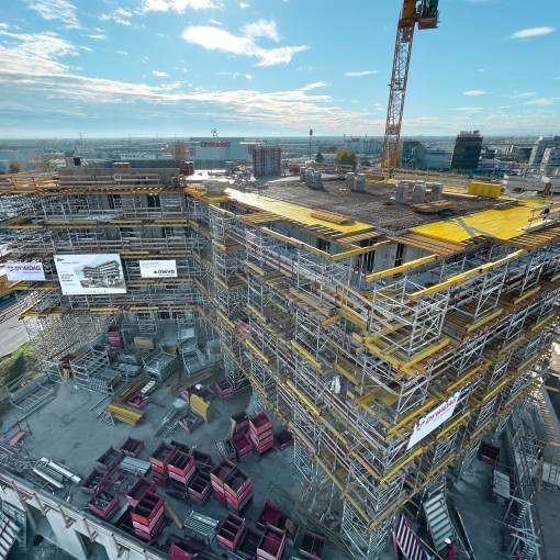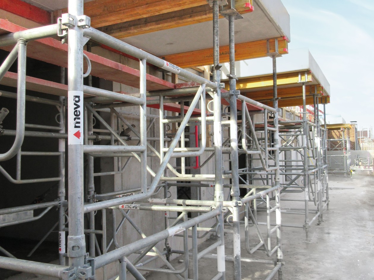 Das modulare Traggerüstsystem MEP dient auf der Siegburger Baustelle zur Unterstützung der hohen Decken im Technikgebäude. Es passt sich flexibel an die Gebäudegeometrie an, ohne lästigen „Stützenwald“. Mit nur wenigen Grundteilen und dem Rahmen wird ein stabiles Traggerüst aufgebaut. MEP ermöglicht eine flexible Höhenanpassung zum Unterstützen von Deckenschalungen, Schaltischen, Unterzügen oder Fertigteilen bis 21 m Höhe. Zusätzlich wurde das stabile Traggerüst MT 60 für die sichere Unterstützung der Balkone eingesetzt.