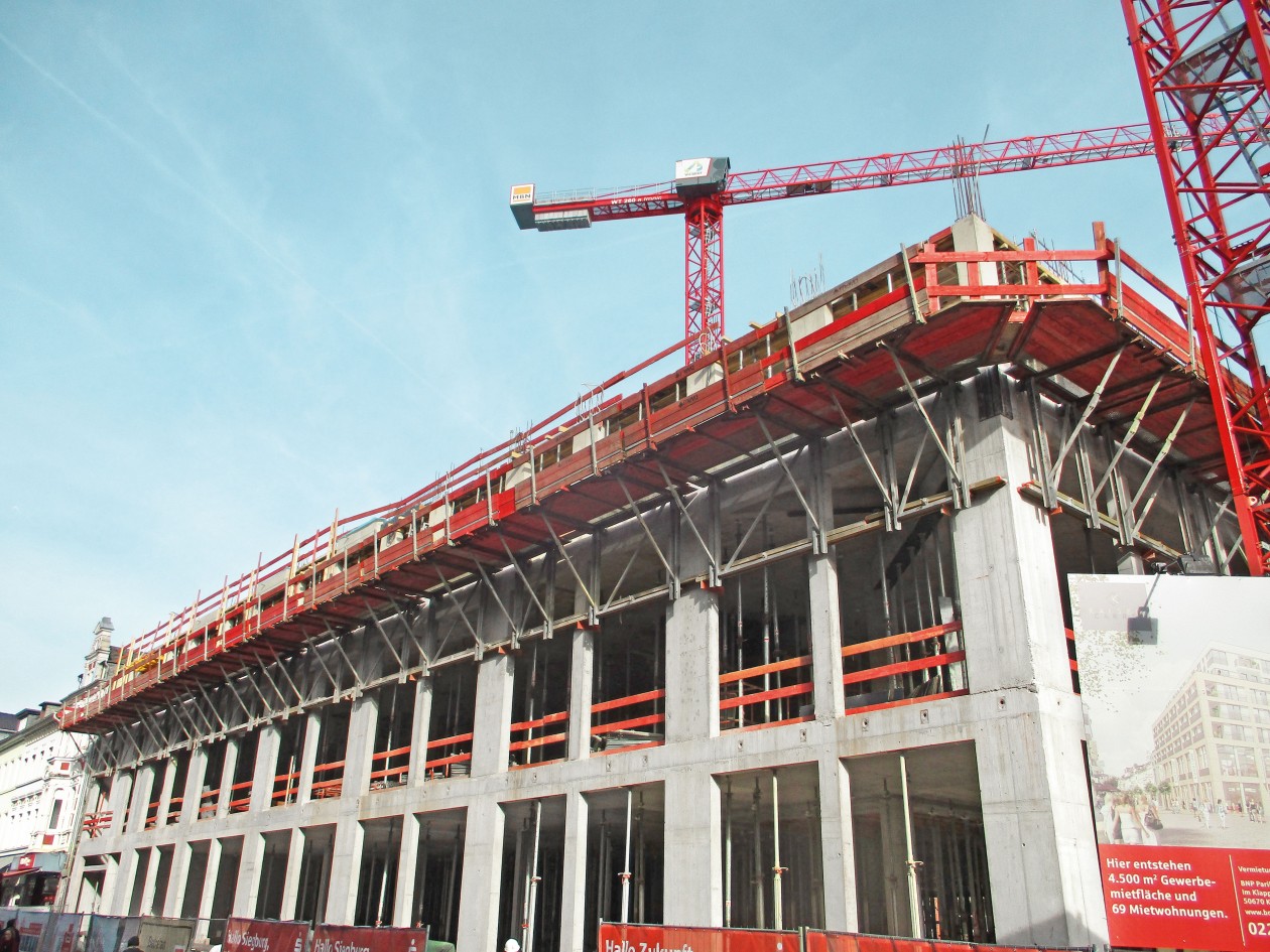 Im Herzen von Siegburg entsteht das Kaiser Carré, ein Geschäfts- und Wohngebäude unmittelbar an der stark frequentierten Fußgängerzone. Die schwierige Anbindung der Baustelle und das vollständig überbaute Plangebiet erfordern durchdachte Logistiklösungen und möglichst geringes Materialaufkommen. Effiziente MEVA-Lösungen unterstützen die MBN Bau GmbH bei der Umsetzung.