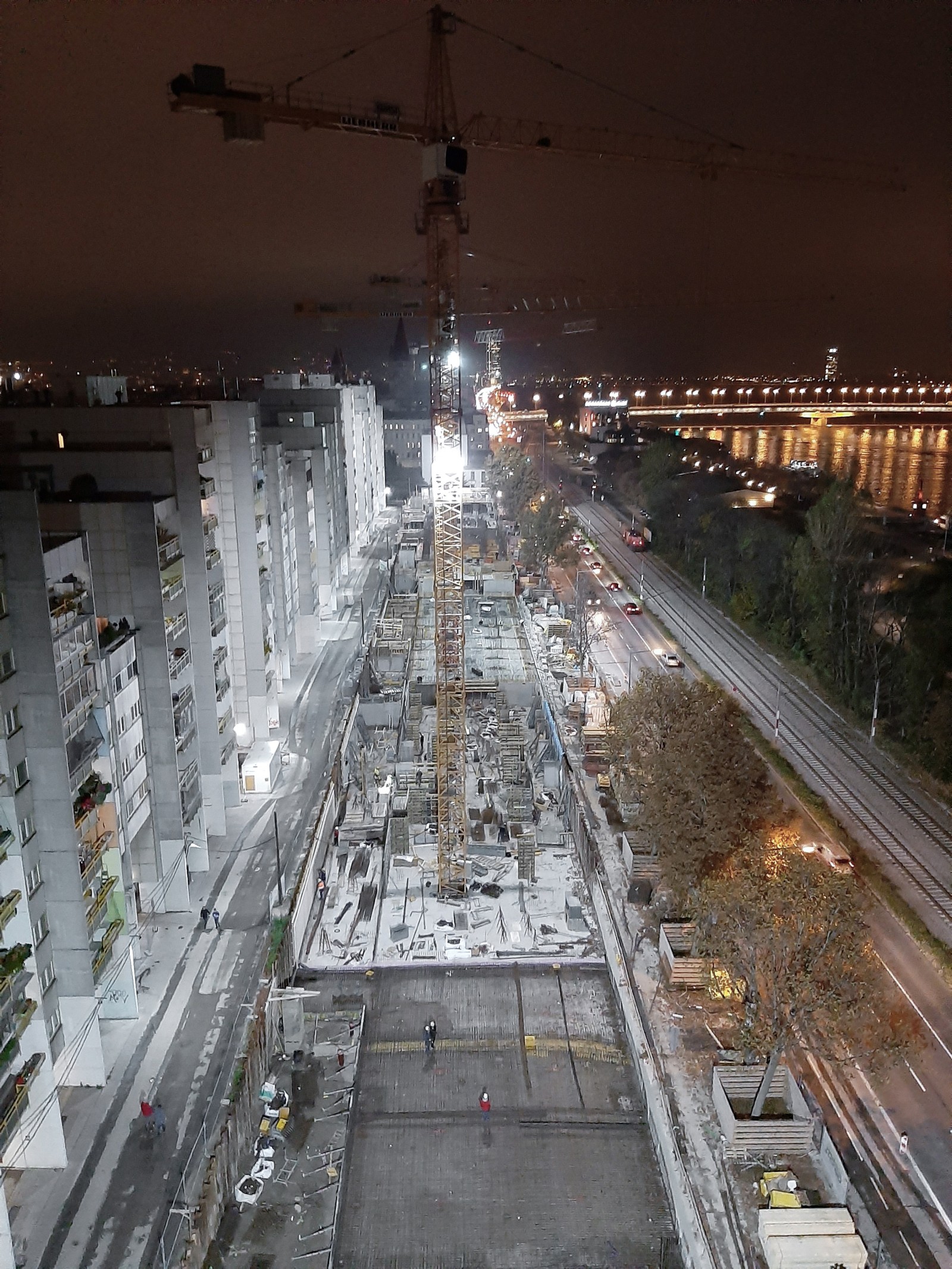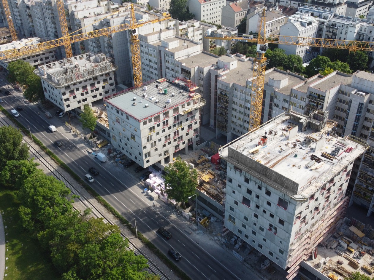 Die städtische Wohnbaugesellschaft WIGEBA beauftragte die GERSTL BAU GmbH & Co. KG mit der Errichtung der Wohnanlage Handelskai 214A. Die rechteckigen Gebäudegrundrisse sind in einer Linie, wie an einer Perlenkette aufgefädelt, auf dem schlanken, 450 m langen Grundstück im belebten Viertel Leopoldstadt angeordnet. Sieben Häuser mit je zwei Parkebenen, Erdgeschoss und sechs bis zehn Obergeschossen wurden pünktlich im ­Sommer 2022 fertiggestellt. Manche Herausforderung galt es zu meistern: anspruchsvolle Baustellen­logistik, einen eng getakteten Zeitplan, intensive Koordination. Sechs Krane waren gleichzeitig im Einsatz und es musste, geschossweise versetzt, mit möglichst wenig Material gearbeitet werden.