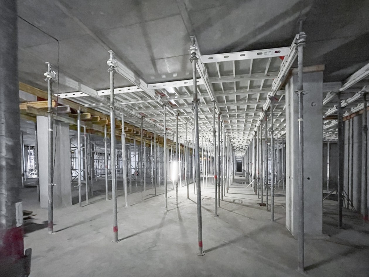 Die erste Etage (22.000 m² Fläche) wurde im Frühsommer 2022 fertiggestellt, seitdem gewinnt das Bauwerk rasch an Höhe. Das MEVA-Schalungszentrum Benelux in Landen, Belgien, lieferte auch die Traggerüstsysteme MEP und MT 60, die sich optimal miteinander sowie mit MevaDec kombinieren lassen. Beide Traggerüstsysteme bestehen aus nur wenigen Grundteilen und Rahmen – für einfache Handhabung, fehlerfreie Montage, transparente Lagerhaltung und schlanke Logistik.