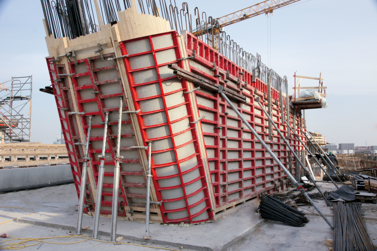 MEVA has developed and uses both standard and special formwork, or a combination of both, to meet the forming requirements for these complex building parts.Steel formwork, for example, is used for rounded corners if required for structural reasons. Trapezoidal areas of inclined cylindrical corner areas are poured with special Mammut 350 wall formwork panels and special designs of MEVA’s circular column formwork Circo are used for the tilted and rounded corners.