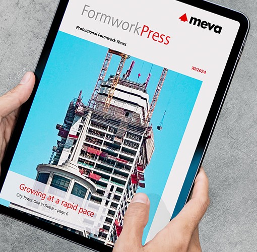 The new MEVA EcoFix formwork system has quickly established itself in many regions worldwide (see pages 6 and 14). One of the secrets of its success is its flexibility, which makes efficient construction progress possible. EcoFix solves the problem of dealing with a variety of column and wall dimensions across projects because of its multi-purpose panels. It is lightweight and easy to construct and offers both birch plywood and alkus all-plastic facing options to deliver a consistently superior concrete finish. The system is idealfor residential schemes, commercial projects as well as infrastructure and civil engineering projects.