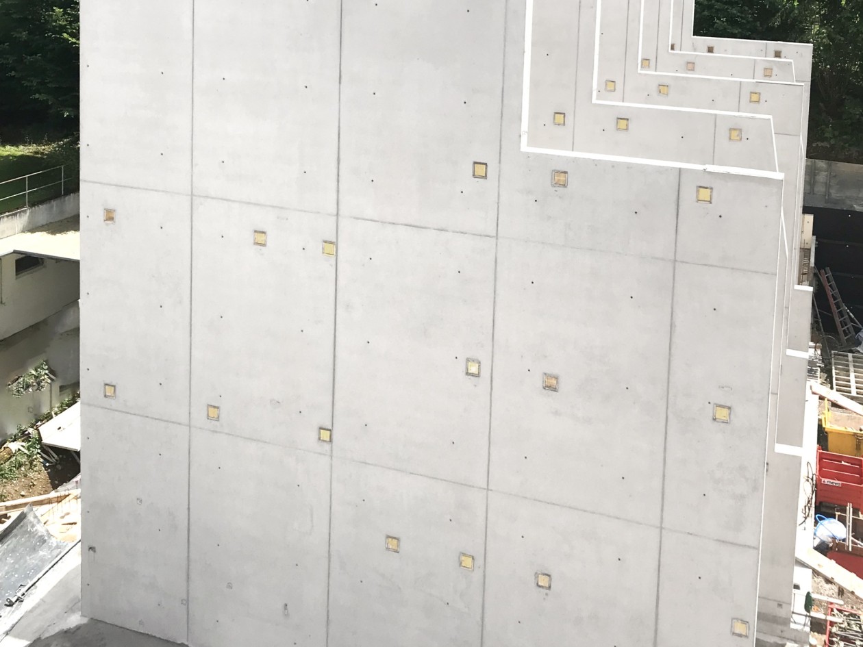 For the first three walls Hächler AG still used load cells and regularly checked the forces acting on the tie rods. With the chosen pouring method, the Mammut XT’s permissible fresh-concrete pressure of 100 kN/m² was, however, not exceeded. It was thus no longer necessary to install load cells.