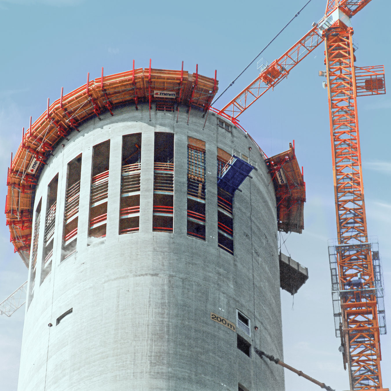 The MGS-H rail-guided screen system provides all-round enclosure of the slab edges in the upper storeys. The system climbs both hydraulically or by crane.