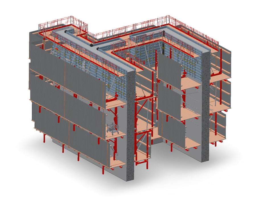 Guided climbing means that after each pouring cycle the system climbs up the building structure by one level. Climbing is done with the help of guiding profiles and climbing shoes while the system is lifted by a crane.