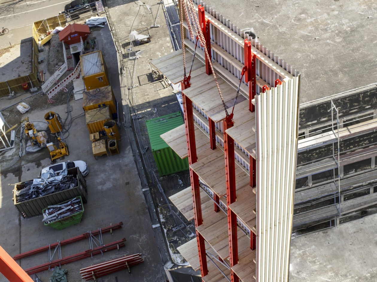 In spring 2022, 18 climbing units were assembled horizontally at two points on the ground. Each unit is between 4.60 and 5.10 m wide and comprises four platforms, guard railings and unperforated trapezoidal metal sheeting. Eight units were additionally equipped with side railings to guarantee safe circulation around the perimeter and maximum safety for the works carried out at the building corners. The units were lifted by crane from the assembly points and threaded from the top into the prepared suspension shoes with folding mechanism. After the guiding rails had been fitted in place and secured by safety locks, the next climbing unit was collected. In this way, the four top storeys of the over 30 m long and approx. 15 m wide building were soon completely enclosed.