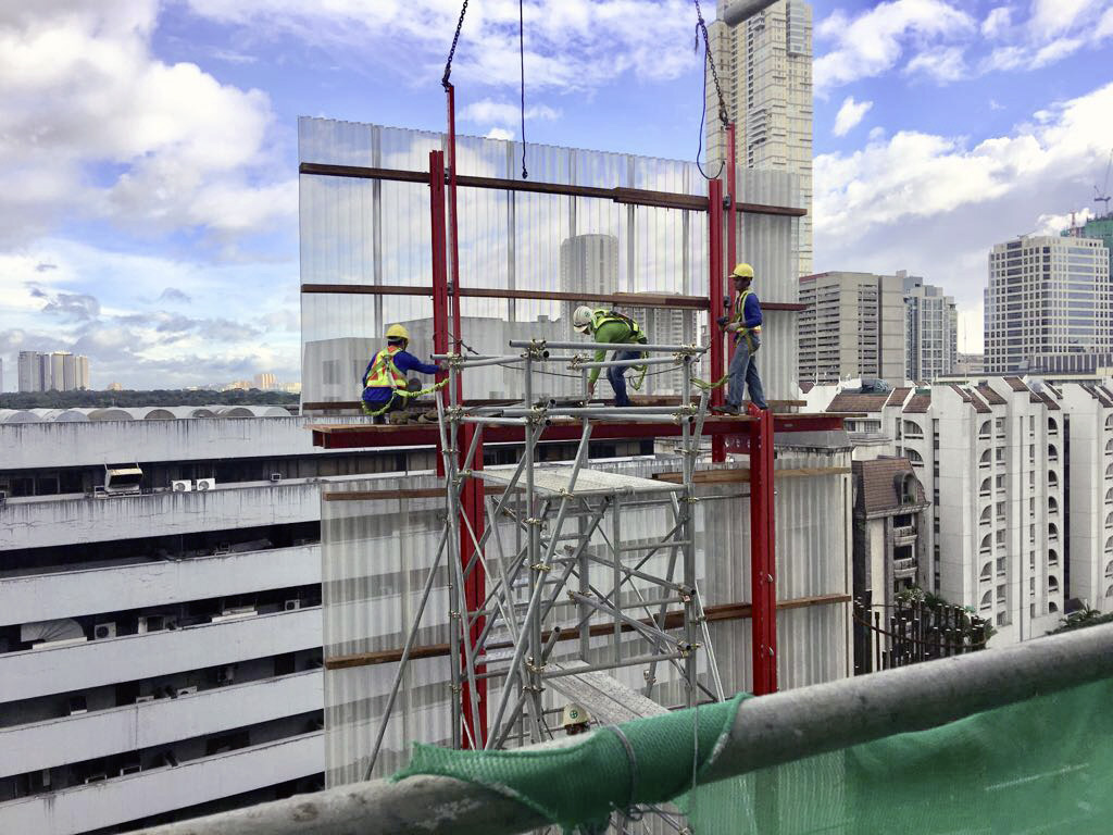 The MGS units are 6.5m wide and include multi-level working platforms for post-tensioning and other works. They play an important role in ensuring worker safety on the MAC automated climbing system. Another factor that needed to be taken into consideration on this project was the weather conditions. When the MEVA engineers examined the reference data for storm events in the Manila region, they knew that a perforated external cladding was an absolute necessity for resisting the high wind loads.