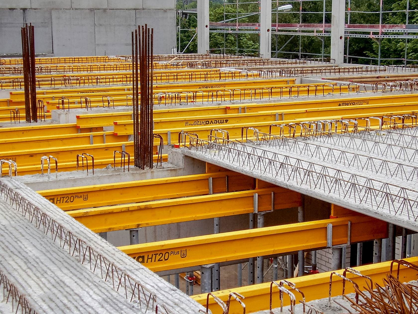Our latest MevaDec slab formwork system is lightweight and easy to use. It is not bound to a rigid grid pattern, meaning that it can be adapted to suit any building layout and any slab thickness.