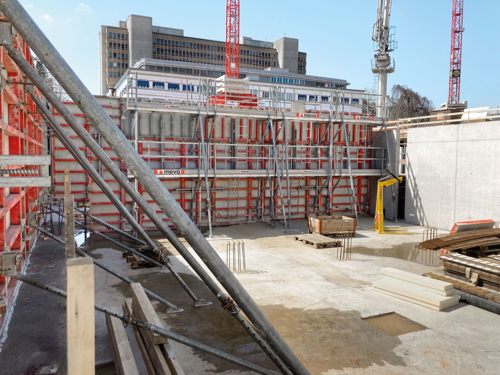 Marti AG Zürich is extending the hospital complex in the capital of the eponymous canton in Aarau through the construction of an extensive replacement building involving systematic use of BIM. MEVA delivered the wall formwork including safety system as well as pre-assembled shaft platforms for the cores.