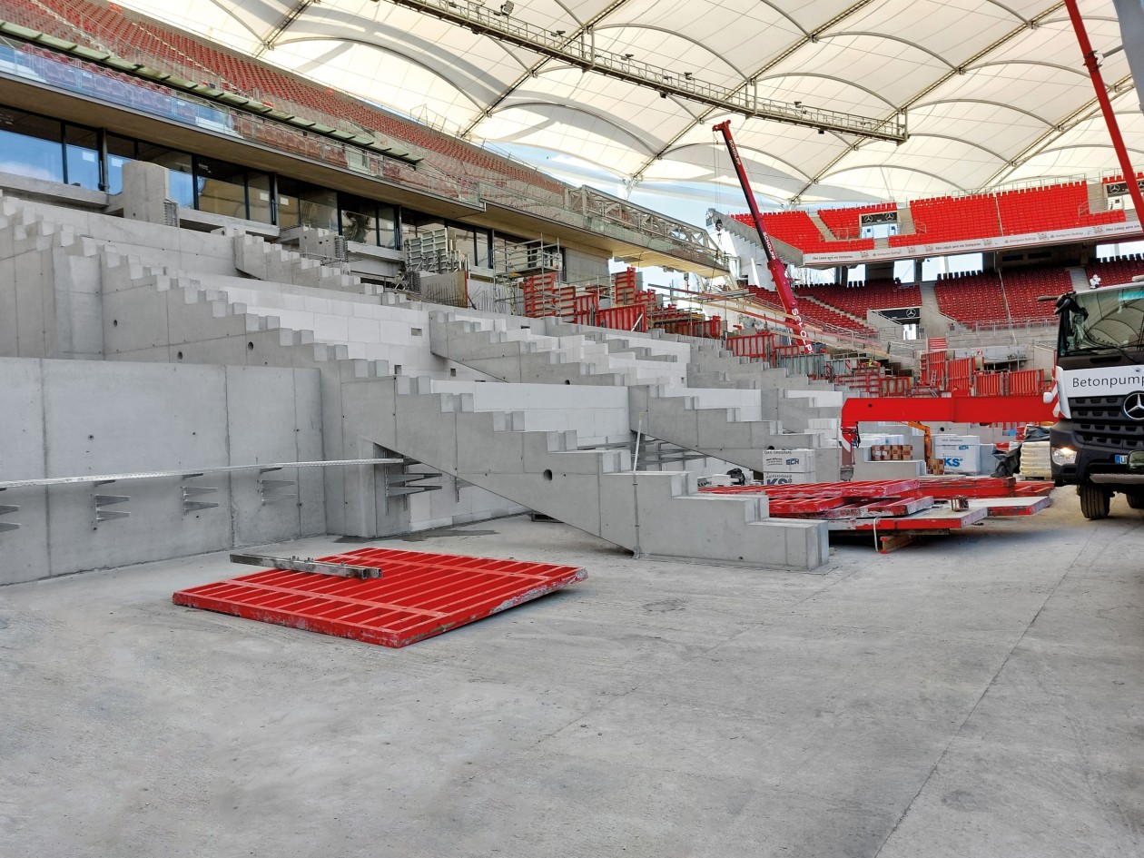 The football fans who support VfB Stuttgart are happy: Their club managed to avoid relegation from the Bundesliga, Germany’s top league, at the end of the last season and returned recently to a freshly modernised home base. The sixth-largest stadium in Germany shines in new splendour after the complex renovation of the grandstand. MEVA delivered special solutions, formwork, shoring tower systems and the formwork planning.