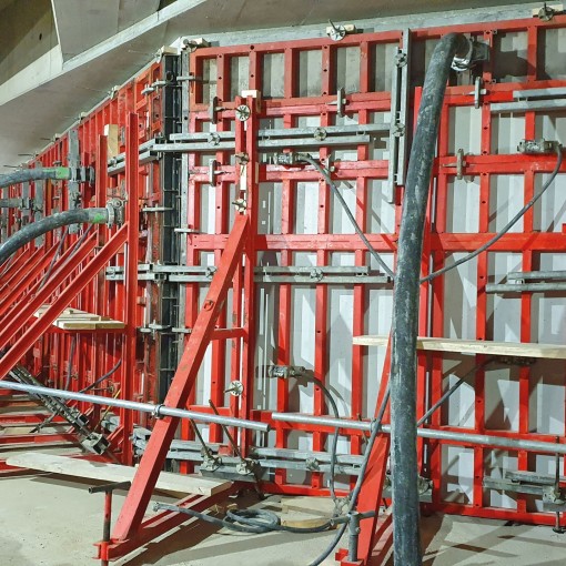 Thanks to their flexibility, the MEP and MT 60 shoring towers made the work easier, for example when supporting overhangs and slabs that were to remain in place or be demolished in order to make room for stairwells and lift shafts. Corresponding constructions were erected using the MT 60 shoring tower, Triplex SB heavy-duty props and EuMax props. The MT 60 shoring tower was also used for the construction of 40 cm thick slabs with concrete beams and scaffold heights from 5 to 8 m, often combined with the MEP shoring tower. Slabs with scaffold heights up to 5 m were poured using MevaFlex.