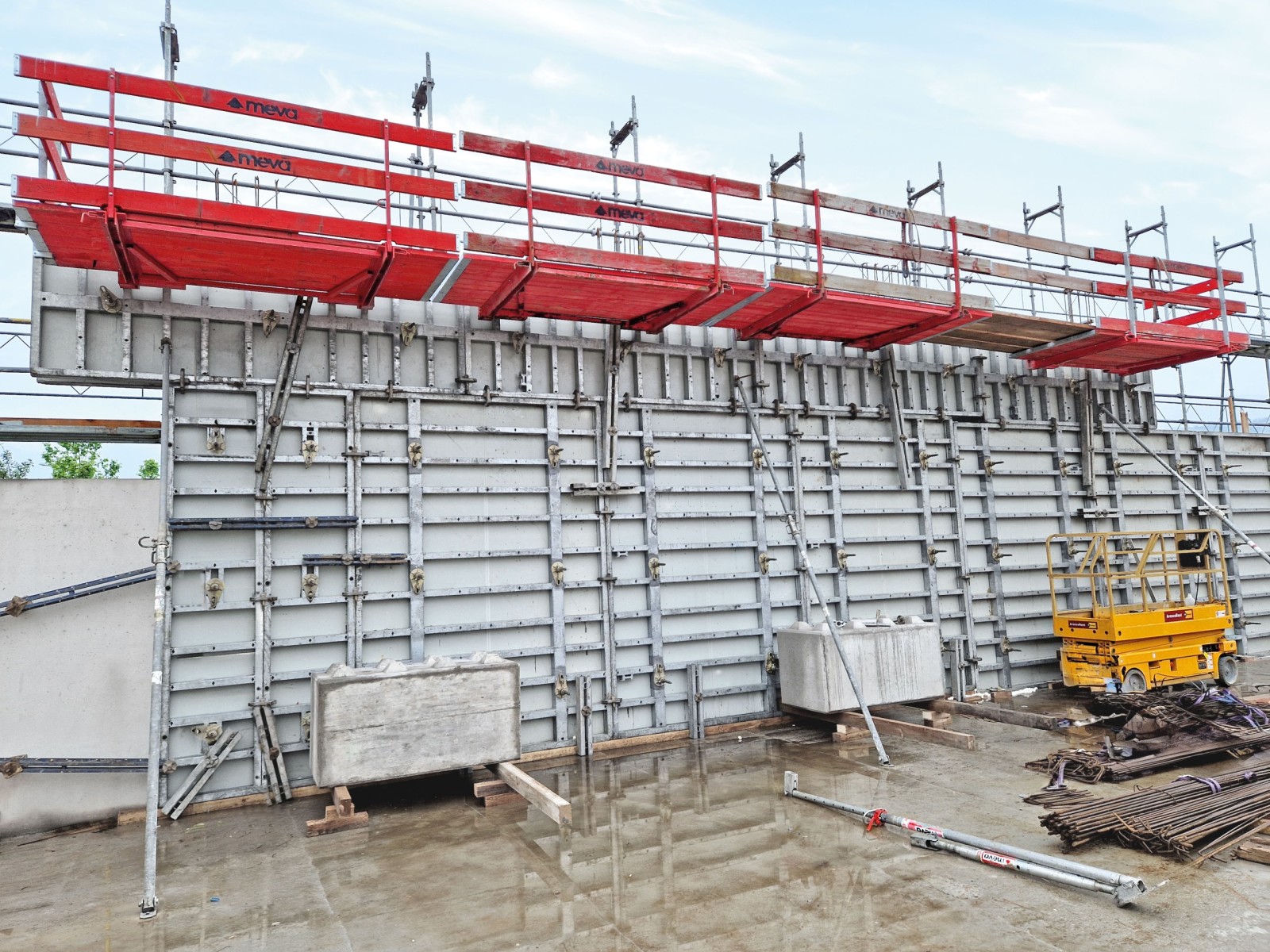 24 BKB folding access platforms from MEVA ensured safe working conditions at all times during the project in Wettingen. The BKB is ready for use in a short space of time, as it unfolds when lifted, hooks onto the wall formwork by means of self-locking suspensions and immediately guarantees comfortable working conditions on 125 cm wide and 140-300 cm long platforms. In combination with Mammut XT, Hächler AG profited from an ideal solution for rapid construction progress.