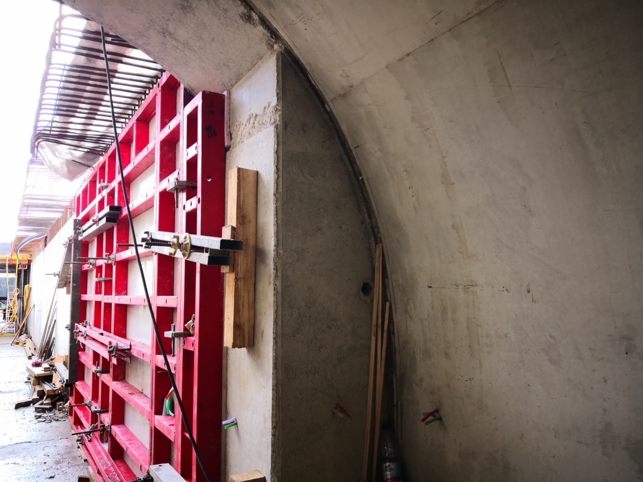 The first step was to construct the end walls connecting the rescue tunnels to the existing road tunnel. To form the junction with the arch of the new mined tunnel section, specially designed formwork was designed for the top part of this connecting wall.