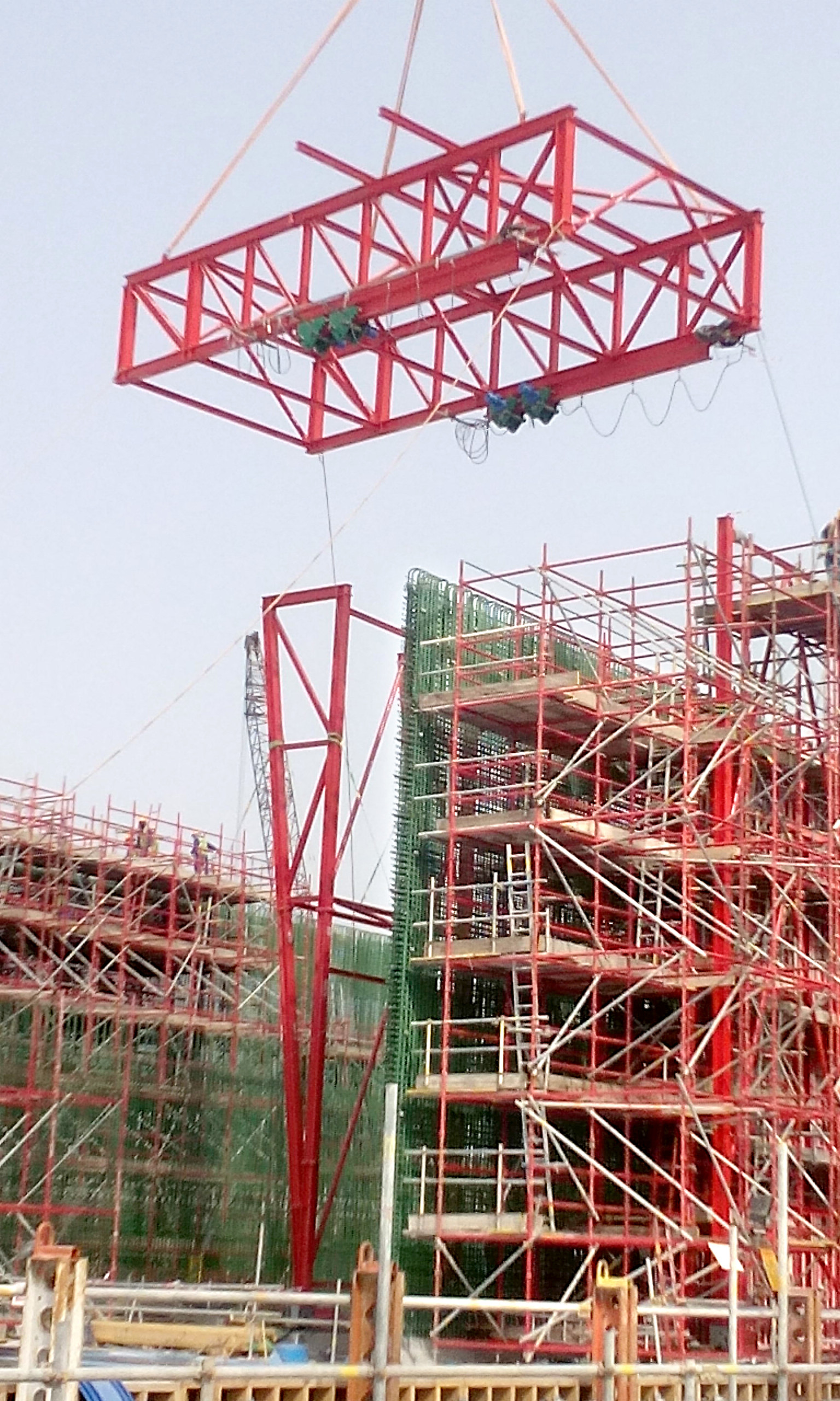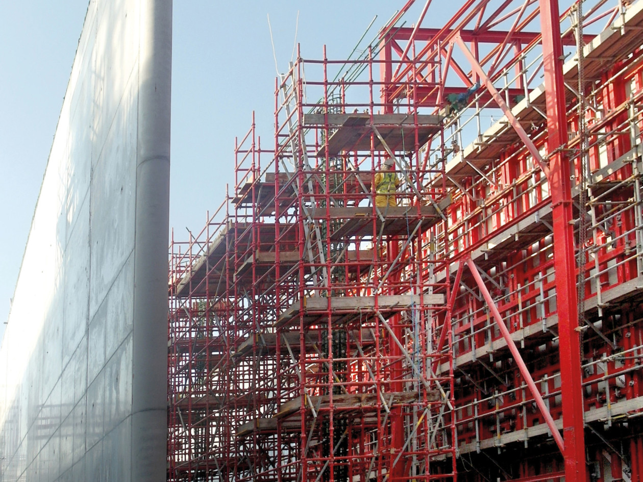 To create the unique columns, a special column formwork that handles fresh-concrete pressures up to 90 kN was produced locally according to MEVA specifications. The 12-metre-high columns were poured with 36 sets consisting of 4-metre-high panels, while columns higher than 12 metres required 20 extension sets with 3-metre-high panels. The column formwork was supported by Cuplock towers, attached using screws and wedges.