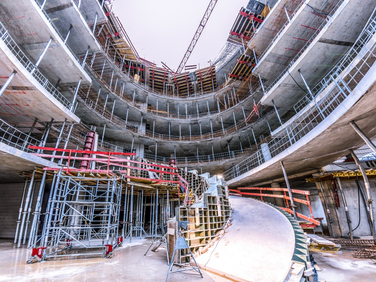 The fact that the stair flights project beyond the building levels and are offset relative to each other necessitated an integral concept for supporting the individual staircase elements. The team from distinguished contractor Ed. Züblin AG used MEVA’s MT 60 shoring tower system to build a series of platforms for the high-precision support of the special formwork. Detailed planning of the individual elements then made it almost as easy to assemble the special formwork as the shoring tower itself. The feedback from the site managers was overwhelmingly positive: “MEVA did a really brilliant job.” The constituent parts of the special formwork were designed with inch-perfect accuracy and labelled in accordance with an assembly drawing to facilitate erection. The MT 60 shoring tower likewise impressed by its straightforward assembly – without tools, in horizontal or upright position – and lightweight components weighing a maximum of 15 kg.