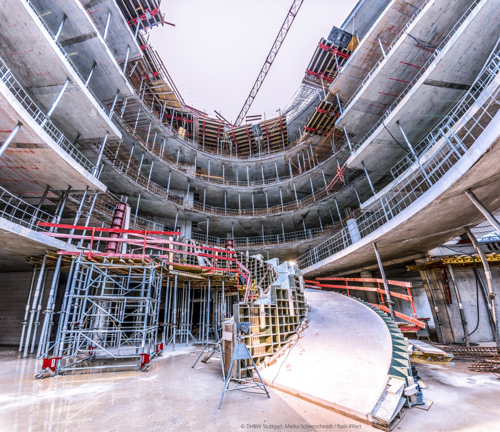 A real eye-catcher for visitors, the spiral staircase at the DHBW circles slantingly upwards across all building levels. The responsibility for designing the formwork fell to MEVA’s Special Design Office, headed by Jochen Moosmann. As he explains, the detailed planning required a considerable amount of manual input. “The formwork comprises a series of individual volumes which first had to be designed in 3D, then broken up again to ensure that all curves and angles are a perfect match.” Construction of the staircase necessitated the inclusion of a joint between ramp and parapet that blends well with the overall staircase composition.