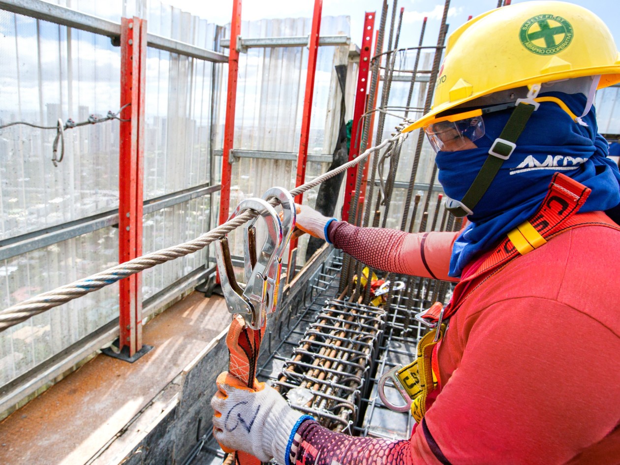 The MAC allows both towers in Makati to grow rapidly, providing workers with a comfortable environment and protection from the elements. The system climbs, hydraulically and crane-independently, together with the wall formwork as a complete, fully enclosed unit. This optimises the construction process and is safer than systems with individually climbing platforms. The fact that work can be carried out on the wall and slab simultaneously also proves to be a major advantage in terms of efficiency and time savings. The suspended Mammut wall formwork can be moved by hand in three directions and precisely adjusted to the geometry of the structure. The elements can be retracted manually, ensuring that the formwork can be stripped quickly and easily. The upper platform provides plenty of working space, storage area and allows the integration of concrete placing booms. Small teams operate the automatic climbing system and from the trailing platforms, the bearing pockets that have just been used can be dismantled and used for new climbing stages. This reduces the material costs, as no lost build-in parts are left over in the concrete.