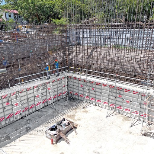 The responsible building contractor, a specialist in the cost-effective construction of such projects, relied on MEVA know-how. The building has two basements and five typical floors, each 3.25 m to 5.90 m high. The project manager was delighted with the quality of the equipment and the easy assembly of the formwork systems EcoFix and MonoDec and of the shoring system MEVA32.