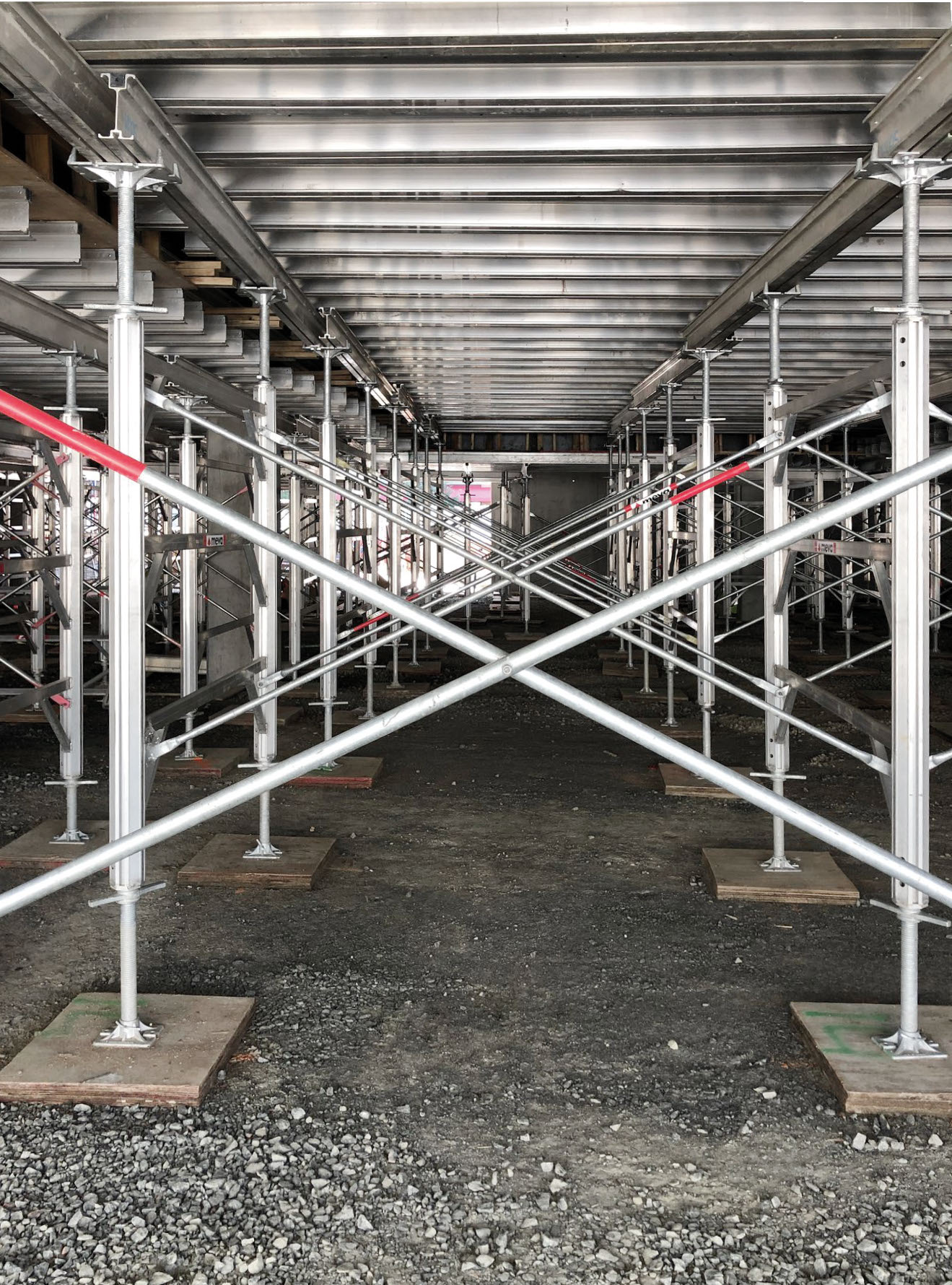 The slab formwork was supported by MEVA32, which is designed for high loads and to suit different applications. This versatile yet simple system only requires a few basic components. The light-weight aluminum frame has a total load capacity of 142 kN. The high load means fewer frames are required. Frames are connected together horizontally using cross braces, as well as on their side and lifted into place by crane.