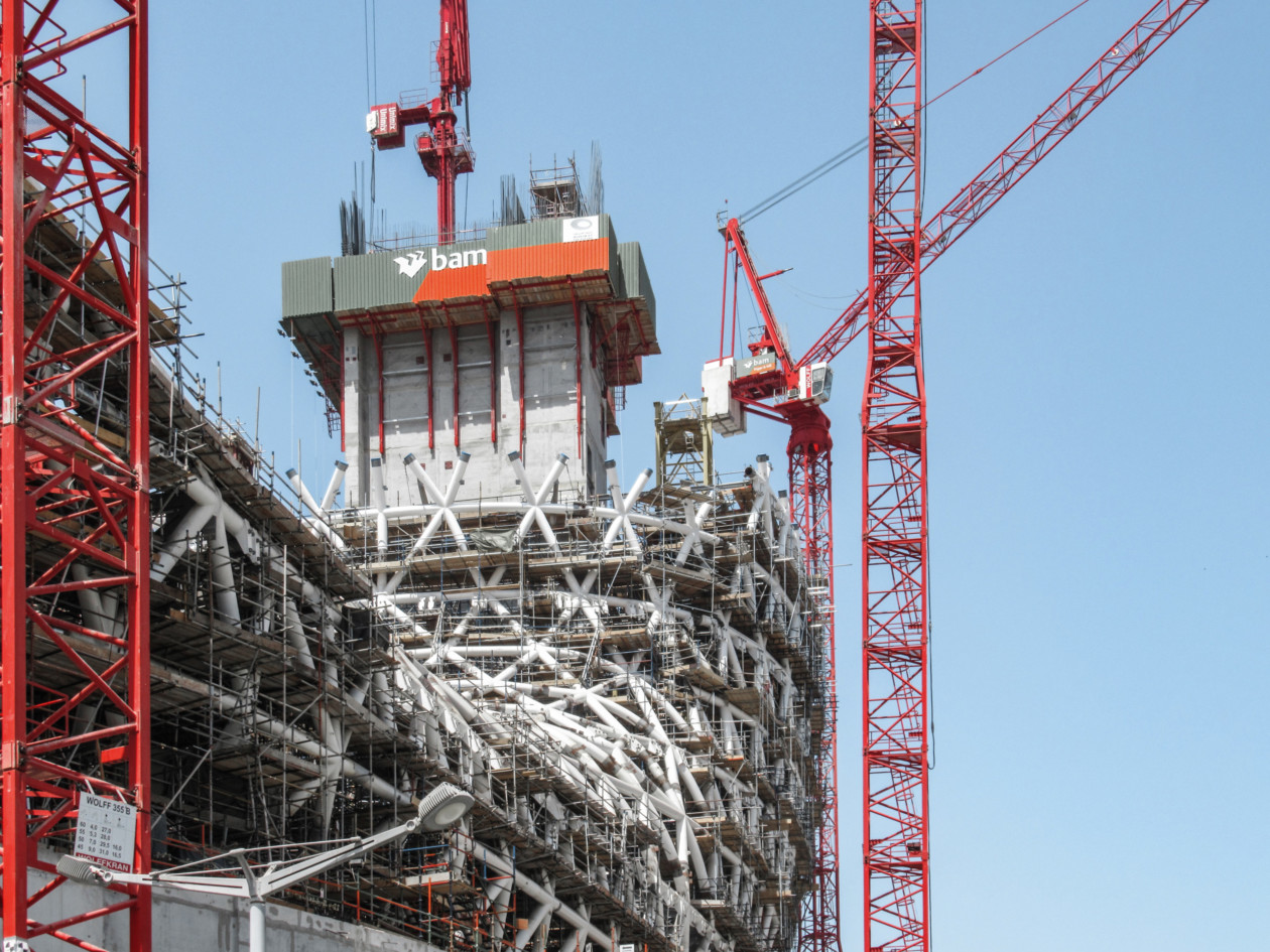 The labyrinthine basement of the Museum of the Future is smaller than the floors above and has no round walls or sloping ceilings.Using the 3.50m high panels of the Mammut 350 wall formwork system, it was possible to form the walls with extreme precision. The rate of placing was immaterial thanks to the fresh-concrete pressure capacity of 100kN/m².
