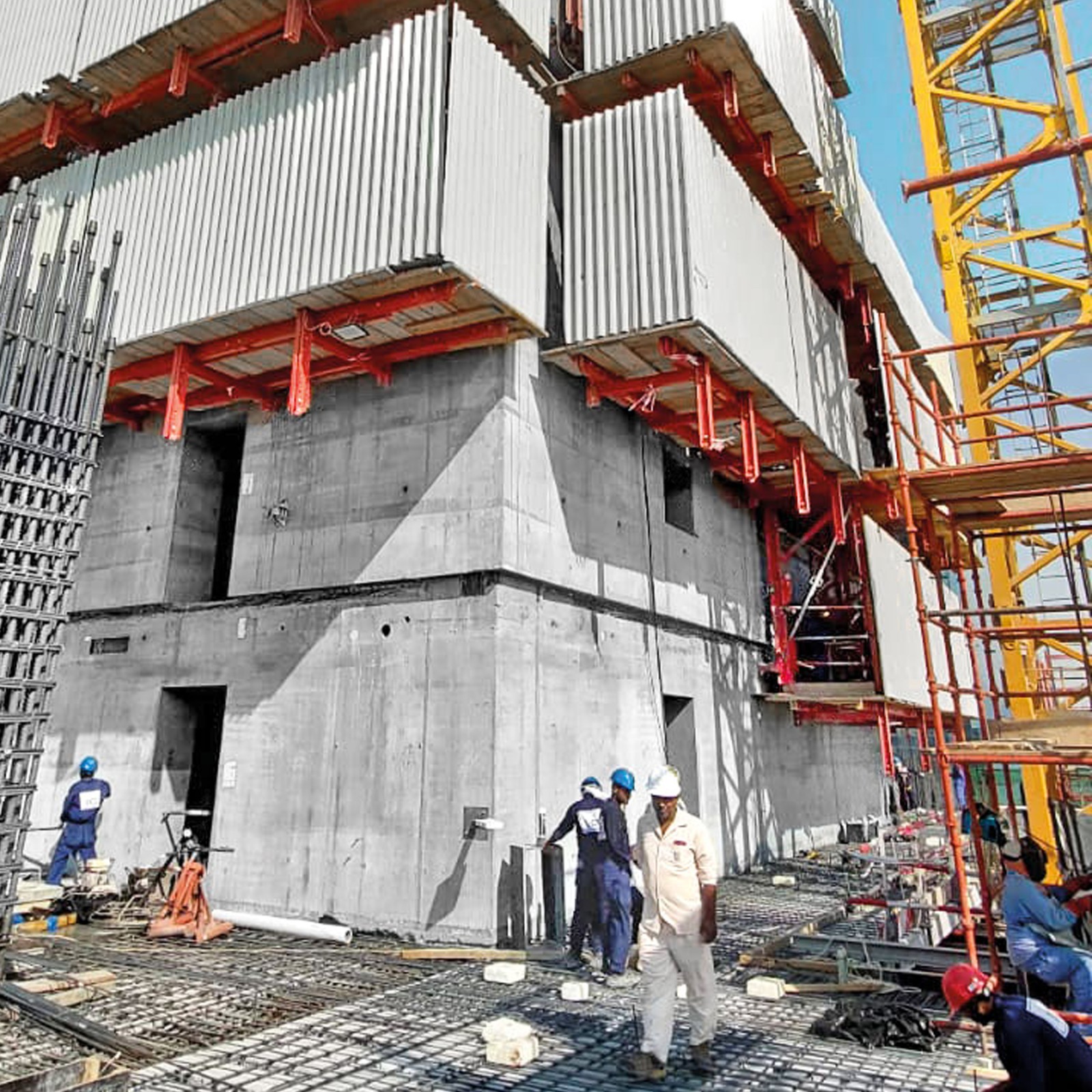 The construction company Dubai Contracting Company L.C.C. (DCC) specialises in high-rise buildings with climbing formwork. After intensive discussions with a team led by MEVA UAE Sales Manager Mahmoud Siksek, the deal was finalised. DCC relied on the German formwork specialist‘s technology for the first time to erect the central core – the backbone of the structure, so to speak. The around 30 x 20 m core extends to the top floor and contains numerous other core walls for staircases and lifts.