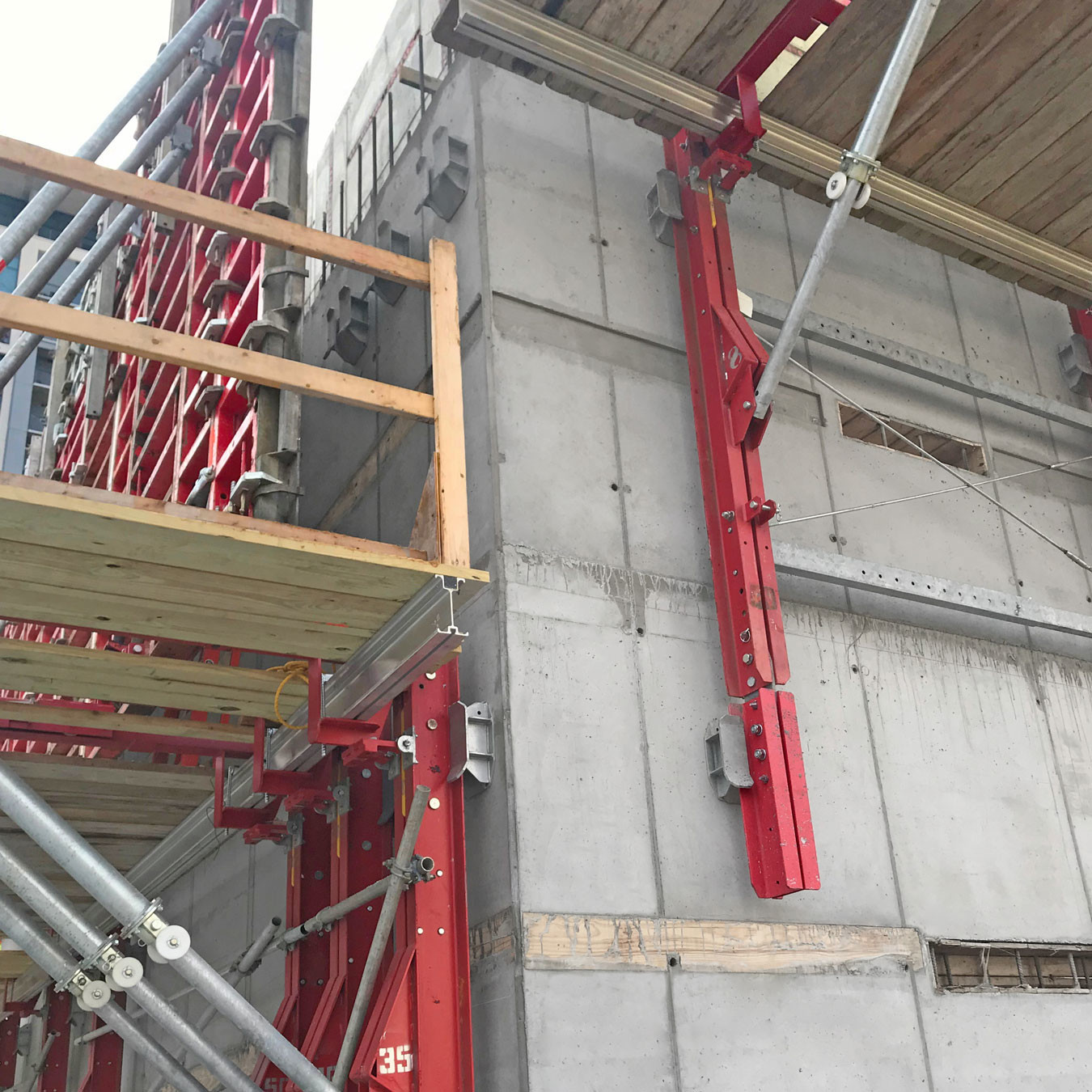 El MGC-F y el encofrado para muros forman siempre una sola unidad. Los raíles guía y las zapatas guía garantizan que permanezca firmemente anclado al edificio incluso en condiciones de viento, tanto en la fase de construcción como en la de trepado.