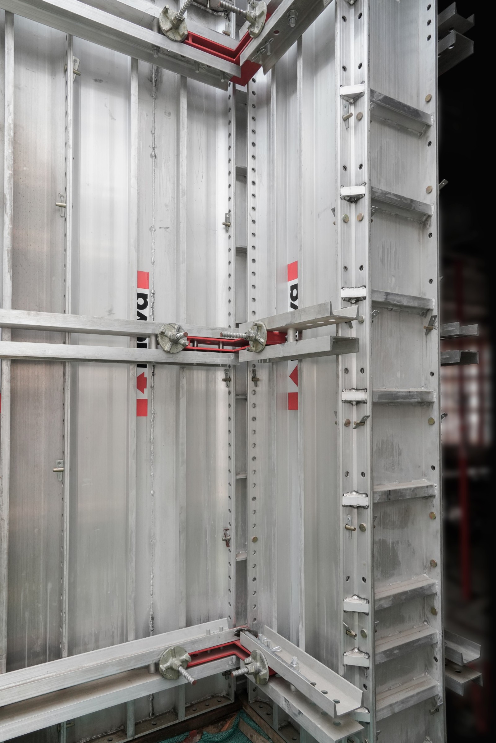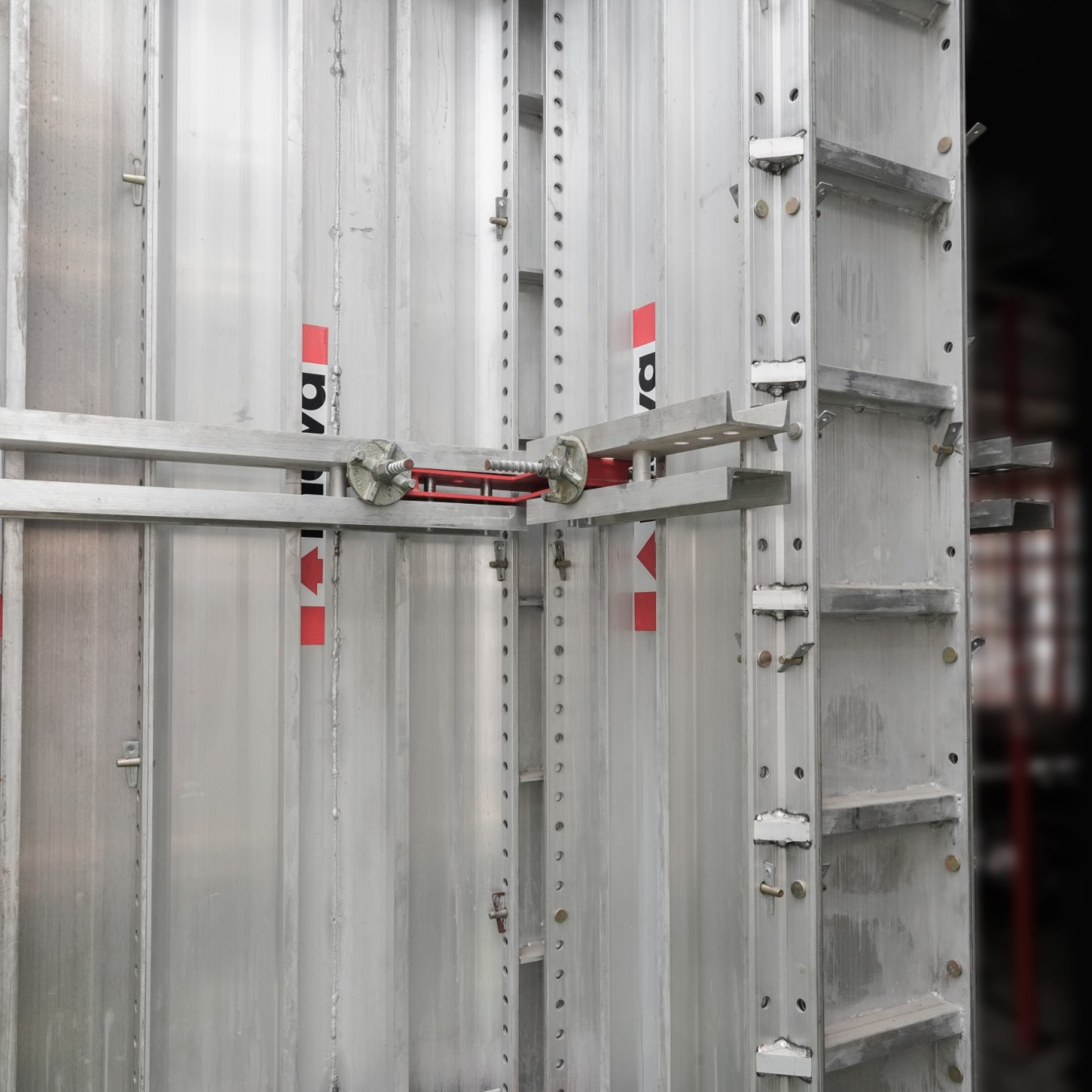 El nuevo MonoWal es un innovador sistema de encofrado de aluminio. Este sistema está diseñado para ahorrar tiempo y mano de obra al eliminar la necesidad de corbatas mediante el uso de rieles de aluminio y varillas de anclaje. El sistema sólo requiere solo tres niveles verticales de varillas de anclaje para una altura de 3 metros. Estas varillas de anclaje pueden espaciarse horizontalmente a 1,2 metros, lo que garantiza un montaje y desmontaje más rápidos, mejorando así la eficiencia en la obra.