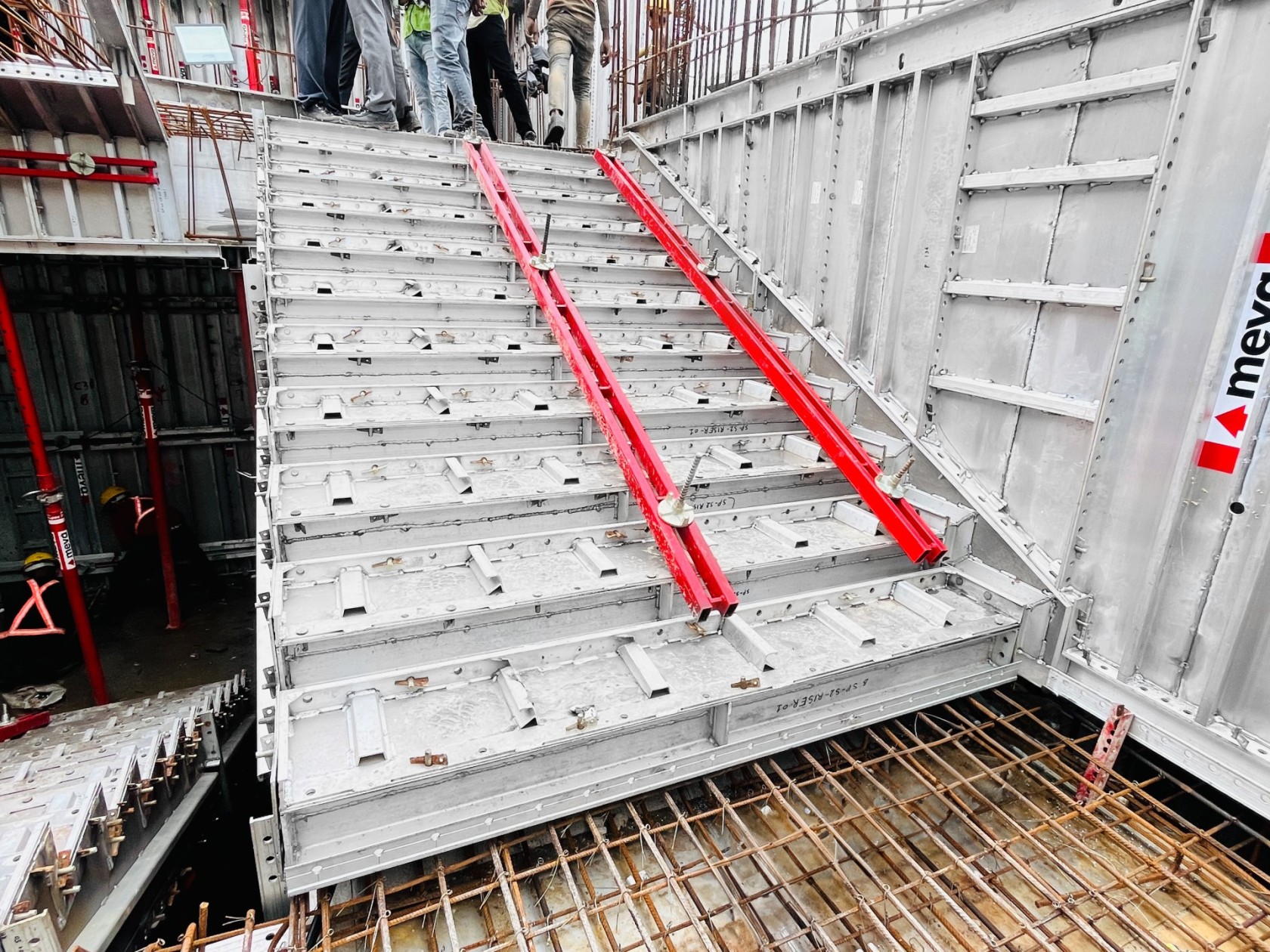 El sistema MonoWal incluye encofrados de escalera integrados. Estos encofrados de escalera están conectados a los paneles de los muros laterales y soportados por puntales MEVA. Las escaleras pueden vaciarse monolíticamente con las paredes y las losas. La producción personalizada de los encofrados de escalera permite a MonoWal ajustarse a los requisitos arquitectónicos.