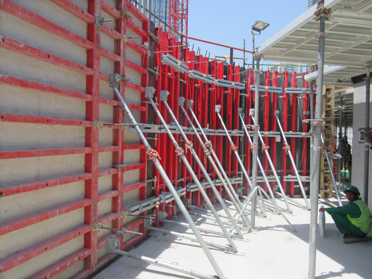 Tras el desencofrado, los muros exteriores de la planta subterránea se sostuvieron con el apuntalamiento inclinado Triplex a fin de asegurarlos durante el llenado del espacio de trabajo.