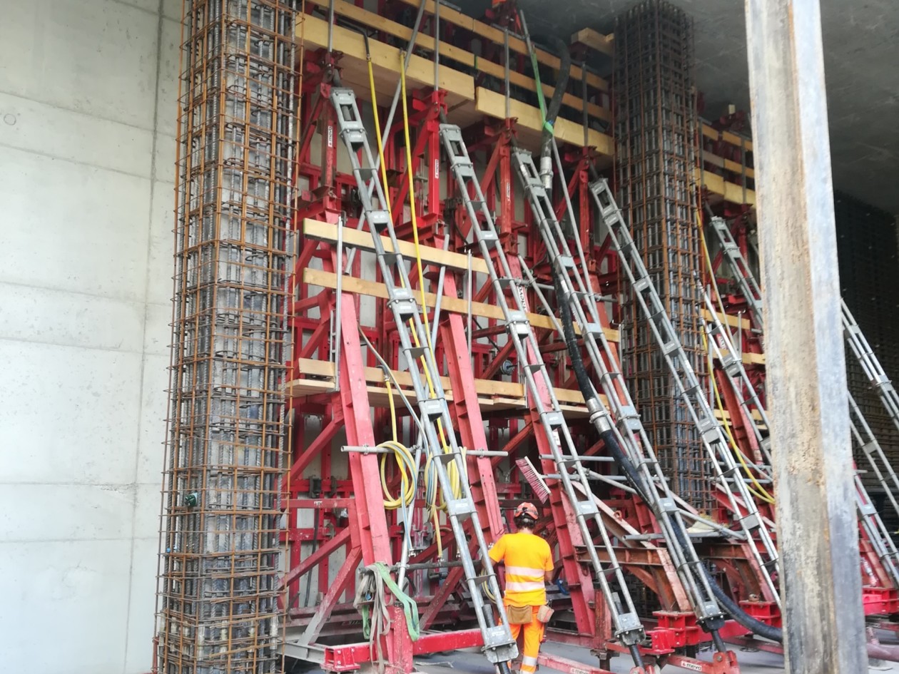 Marti AG apostó por los robustos y compactos marcos de soporte STB 450 así como por el sistema autotrepante MAC en combinación con el encofrado para muros Mammut 350 y la plataforma de seguridad MGS-H.