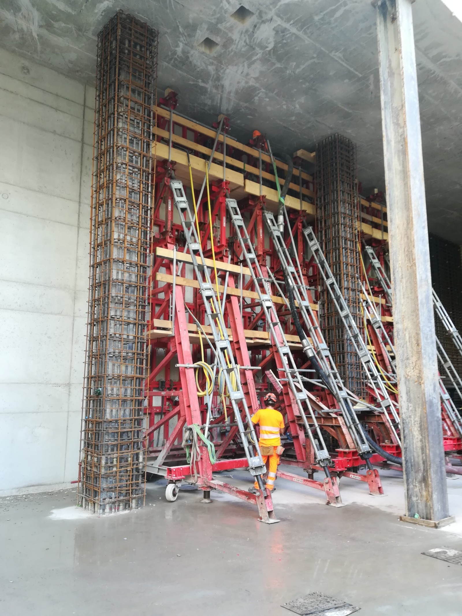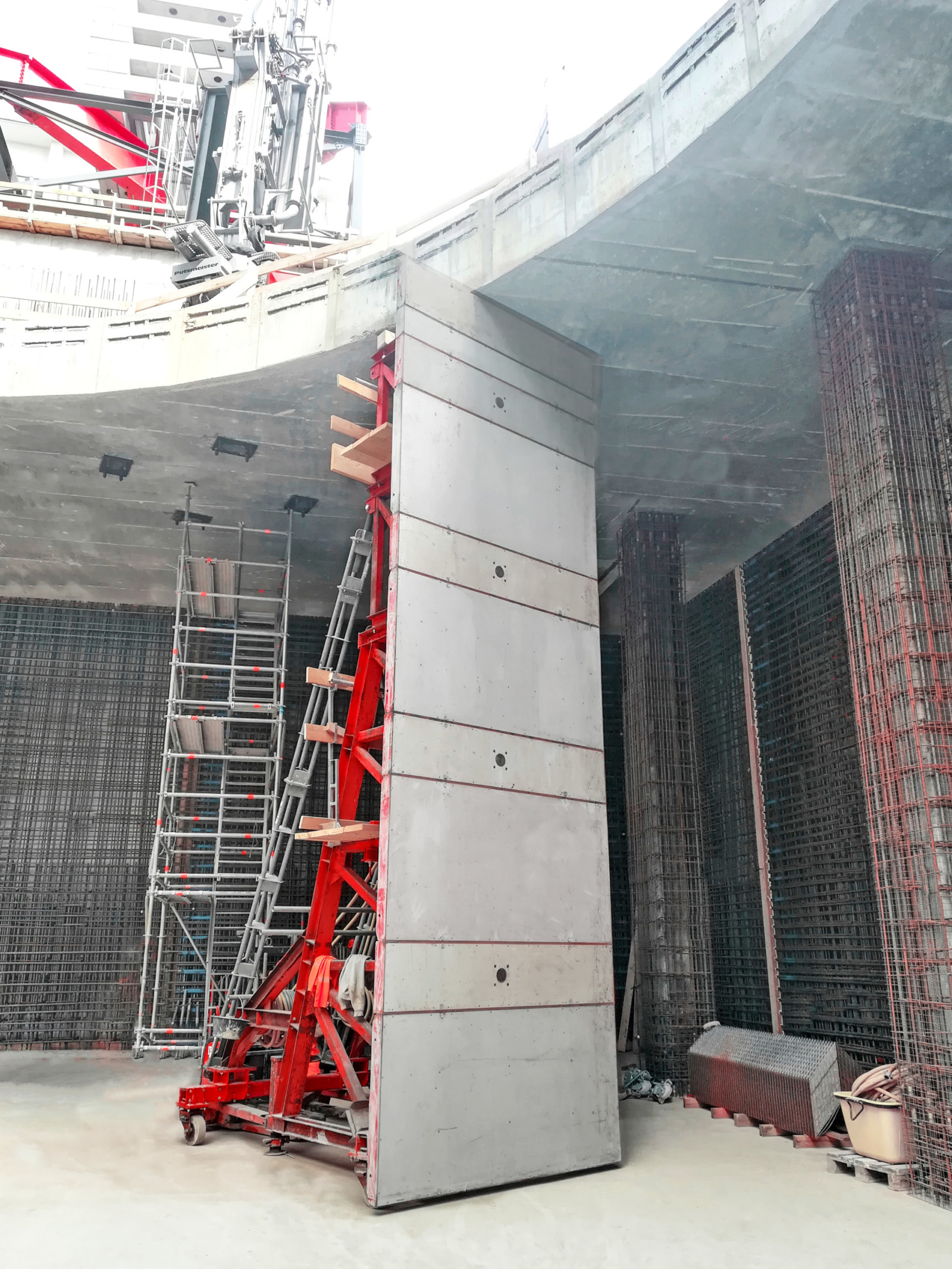 Los muros de los dos núcleos se confeccionaron primeramente hasta una altura de 3,80 m usando el encofrado para muros Mammut 350. Aquí fue importante tener en cuenta la geometría angulada de los numerosos pozos. Los muros se trazaron tridimensionalmente, permitiendo una visualización plástica de las etapas de construcción con el fin de planificar con más precisión los detalles importantes.