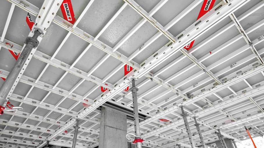 Parmi les trois méthodes réalisables avec MevaDec, la méthode à poutrelles primaires et panneaux a tout particulièrement séduit les chefs d’équipe : quelques coups de marteau sur les têtes décoffrantes pour faire descendre panneaux et poutrelles primaires de 19 cm, ce qui permet, à seulement deux compagnons, de procéder au décoffrage anticipé, alors que les étais restent en place sous la dalle jusqu’à la prise définitive du béton. Les panneaux de coffrage et poutrelles primaires ont ainsi pu être utilisés sans attendre pour mettre en œuvre la rotation suivante. Cette optimisation de la quantité de matériel à mettre en œuvre a permis non seulement de précieux gains de temps, mais également de simplifier les flux logistiques sur le chantier. Et comme MevaDec indique la quantité d’étais à mettre en œuvre, les équipes de chantier avaient beaucoup de place sous le coffrage pour travailler sans entrave.