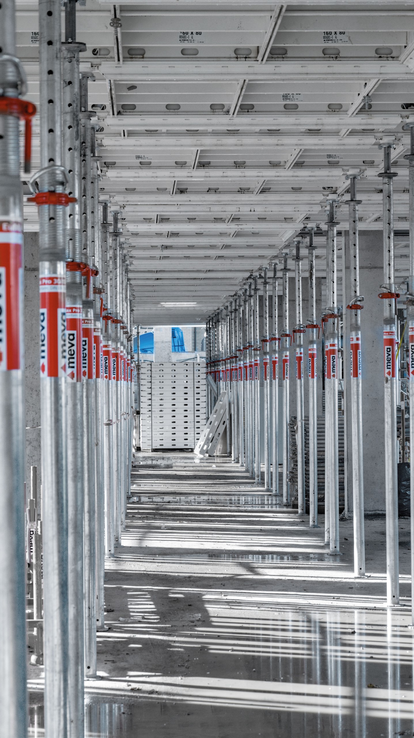 Parmi les trois méthodes réalisables avec MevaDec, la méthode à poutrelles primaires et panneaux a tout particulièrement séduit les chefs d’équipe : quelques coups de marteau sur les têtes décoffrantes pour faire descendre panneaux et poutrelles primaires de 19 cm, ce qui permet, à seulement deux compagnons, de procéder au décoffrage anticipé, alors que les étais restent en place sous la dalle jusqu’à la prise définitive du béton. Les panneaux de coffrage et poutrelles primaires ont ainsi pu être utilisés sans attendre pour mettre en œuvre la rotation suivante. Cette optimisation de la quantité de matériel à mettre en œuvre a permis non seulement de précieux gains de temps, mais également de simplifier les flux logistiques sur le chantier. Et comme MevaDec indique la quantité d’étais à mettre en œuvre, les équipes de chantier avaient beaucoup de place sous le coffrage pour travailler sans entrave.