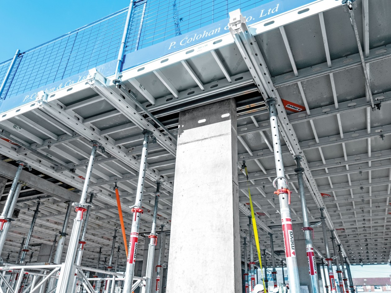 Pour assurer d’emblée une grande qualité aux parements béton, Leeds Acro a investi, en amont du projet, dans de nouveaux panneaux Mammut 350 pour réaliser le coffrage des noyaux des cages d’escalier et d’ascenseur ainsi que des poteaux. De plus, Leeds Acro a également loué de nouveaux panneaux MevaDec chez MEVA UK et les a livrés directement à l’entreprise de construction P. Colohan & Co.