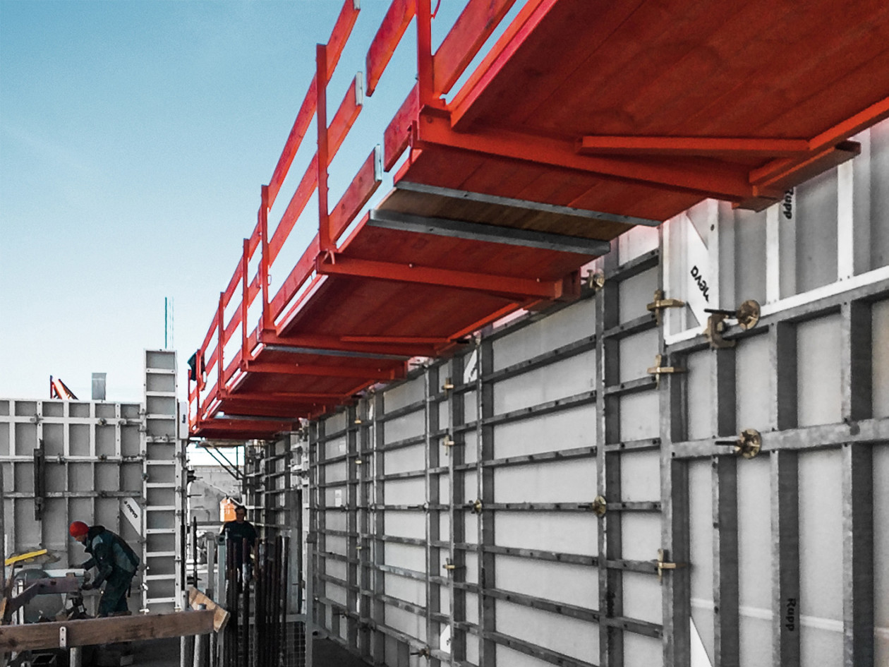 Plate-forme de travail rapide et sûre pour coffrages de voiles. Large de 125 cm, la plate-forme offre un espace de travail confortable – même en grande hauteur.